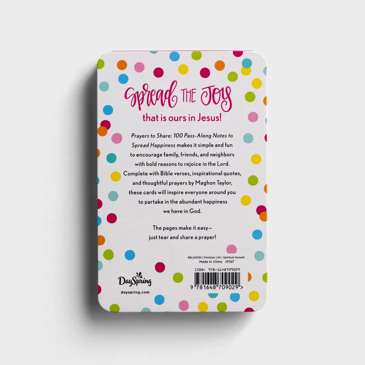 Prayers to Share: 100 Pass-Along Notes to Spread Happiness makes it simple and fun to encourage family, friends, neighbors, and acquaintances with bold reasons to rejoice in the Lord during the busyness of life. Complete with Bible Verses, inspirational positivity affirmations, and thoughtful prayers from Maghon Taylor, these prayer cards will inspire everyone around you to celebrate the abundant happiness, we have in God. These pages make it easy, just tear and share a prayer.
