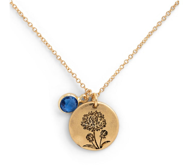 A gold tone necklace with both a birthflower charm and a birthstone charm. Each one is beautifully packaged for gift giving.