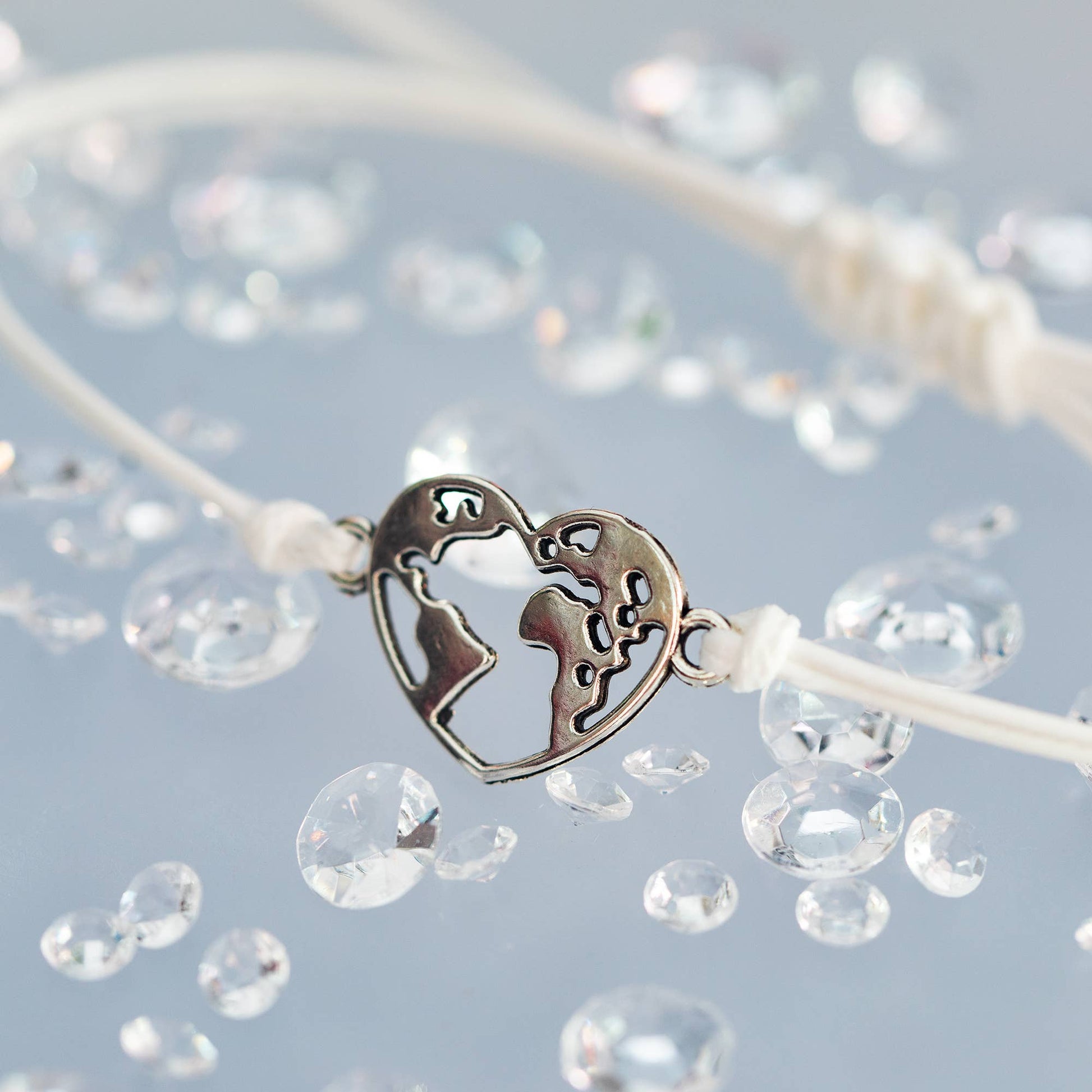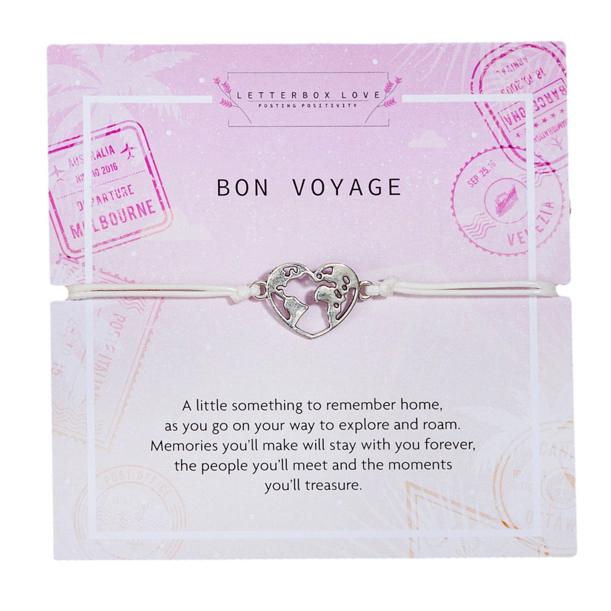 Our Bon Voyage bracelet reminds them that the world is their oyster. Featuring a heart shaped globe design mounted on a fine, contemporary thread bracelet.