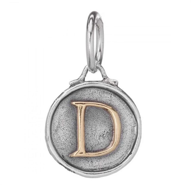 Simple and strong, the body of this sterling silver seal has a contemporary impression with a thin waxy rolled edge, highlighting a grounded serif style brass initial. Charm is 1/2 inch in diameter. Sterling Silver and brass.