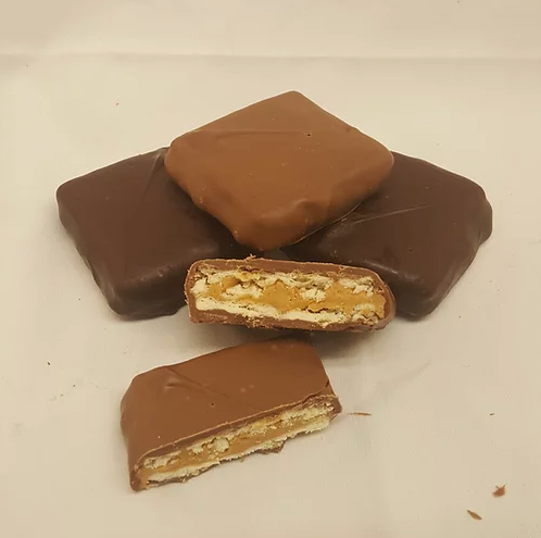 Fresh peanut butter sandwiched between two saltines and covered in chocolate.