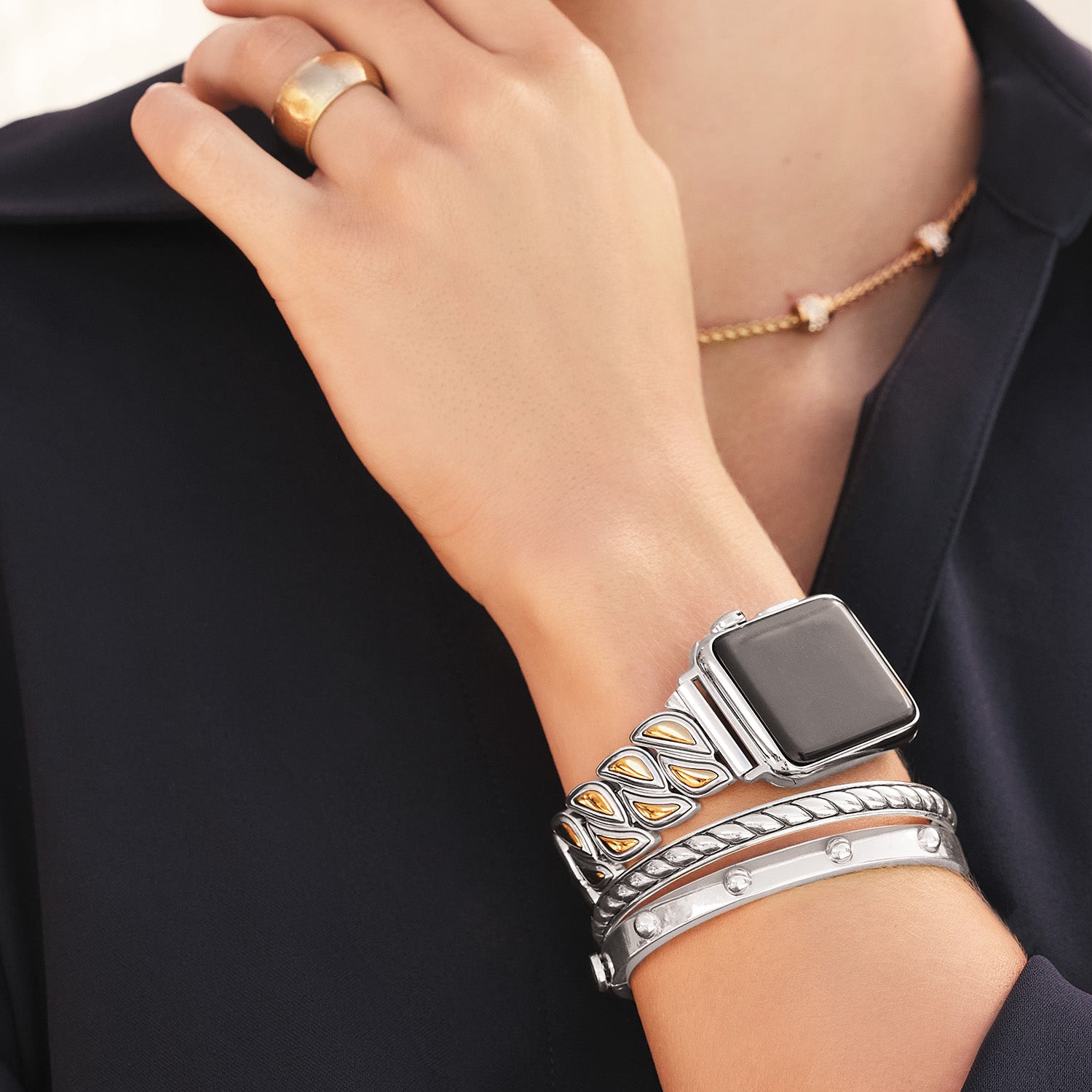 Add this unique link design that is two-tone to your stack! An every-day style band, it goes with all of your silver and gold jewelry, making it ultra-versatile. It comes with 1 removable extender link.