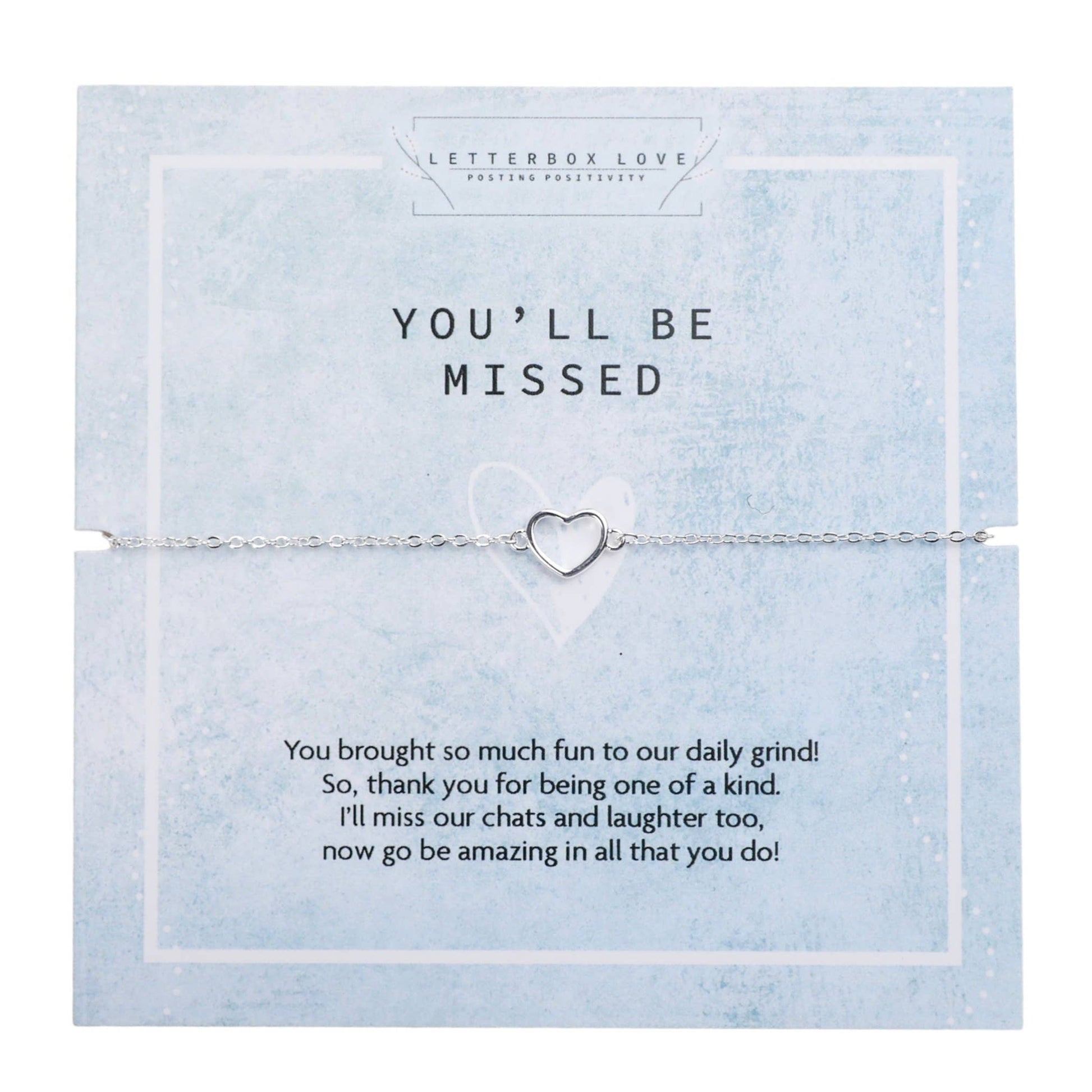 You'll be missed You brought so much fun to our daily grind, So, thank you for being one of a kind. I'll miss our chats and laughter too, now go be amazing in all that you do! Send off a cherished friend or work colleague with this dainty 'You'll Be Missed' bracelet. Its simple yet elegant bracelet with a heart-shaped charm reflects the sweet sentiment of your goodbye. This silver chain bracelet, presented on a soft blue card with a heartfelt message, serves as a reminder of shared memories and well-wishes for her new beginnings.