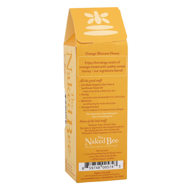 1.5 oz. Orange Blossom Honey Hand & Body Lotion: Aqua (Purified Water), Cert. Organic Aloe Barbadenis Leaf Juice, Octyl Palmitate, Cert. Organic Helianthus Annuus (Sunflower) Seed Oil, Stearic Acid, Glycerin, Cetearyl Alcohol, Cera Alba (Beeswax), Glyceryl Stearate, Camellia Sinensis Leaf (White & Green Tea) Extract, Spirulina, Ascophyllum Nodosum (Kelp) Extract, Arnica Cordifolia (Arnica) Extract, Lavandula Angustifolia (Lavender) Extract, Calendula Officinalis (Marigold) Extract, Hamamelis Virginiana (Witch Hazel) Extract, Usnea Barbata (Alpine Lichen) Extract, Hyaluronic Acid, Honey, Mixed Tocopherol (Vit. E), Ergocaliferol (Vit. D), Phenoxyethanol, Ethylhexylglycerin, Phthalate-free Fragrance.