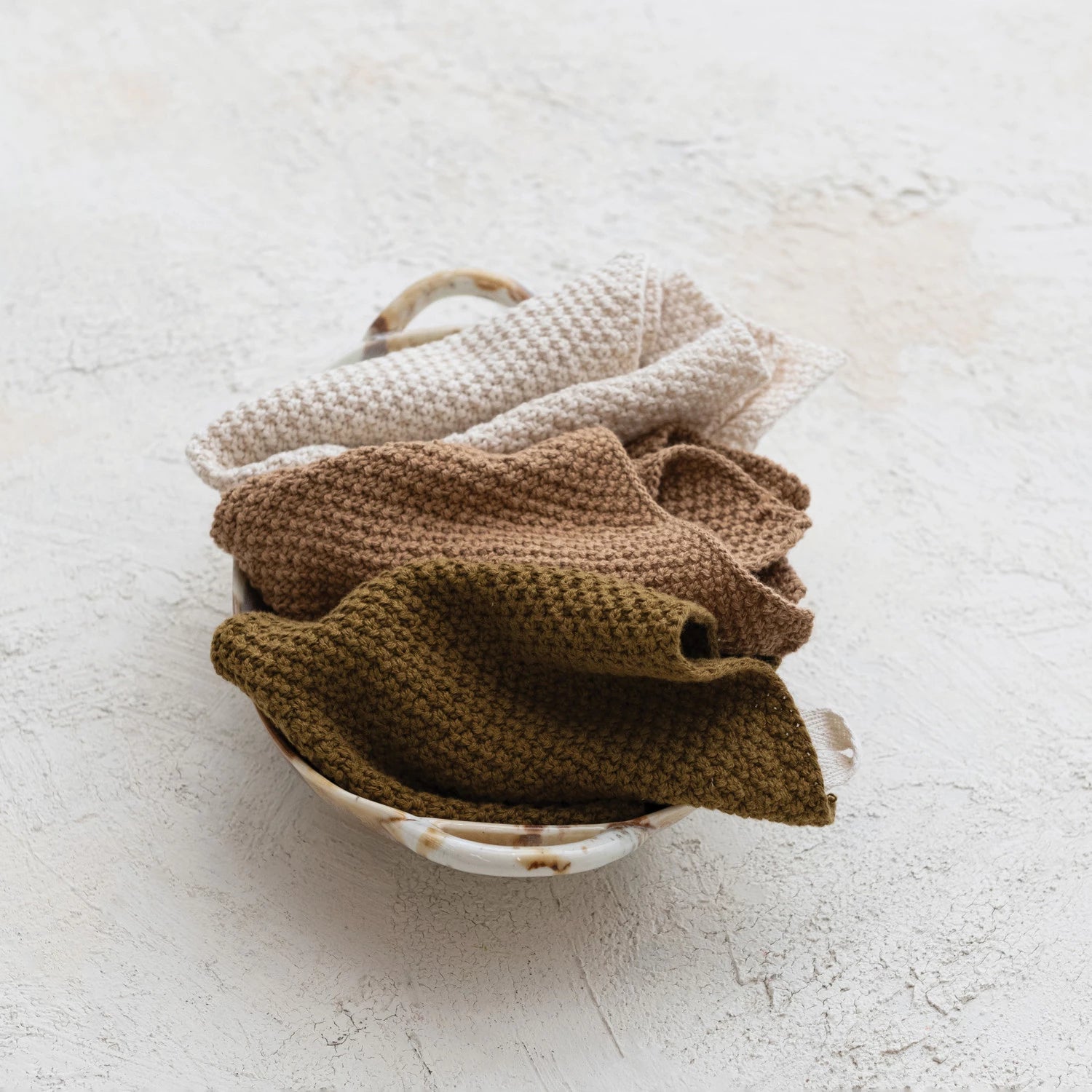 10-1/2" Square Cotton Knit Dish Cloths, Multi Color, Set of 3 Tied w/ Cotton Tape