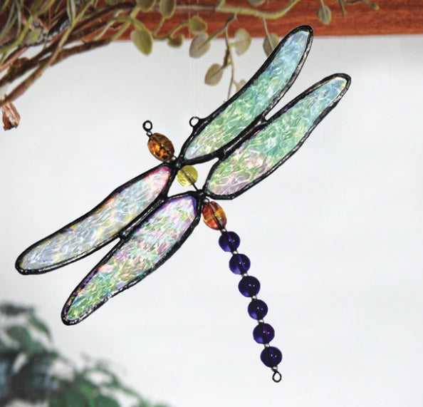 For centuries, dragonflies have been used as symbols of renewal and zest for life. Capture that same positive energy in your home with this dragonfly glass ornament. This playful art glass dragonfly features iridescent glass wings which shimmer with a rainbow of colors. The pebbled textured glass adds depth to the piece and diffuses the light in even more directions. The body made with beads in a vibrant shade of blue add to the energy. Display as a sun catcher in a window during the winter months to brighten your room. Then leave it up as a reminder that nature is waiting for you to come out and enjoy it. DIMENSIONS & CARE 5 7/8" x 4 3/8" Buff with dry cloth as needed DESCRIPTION Clear textured iridescent glass wings and a beaded body create this colorful dragonfly orna ent Each dragonfly sun catcher comes with a nylon string to suspend it from the suction cup that has been included.