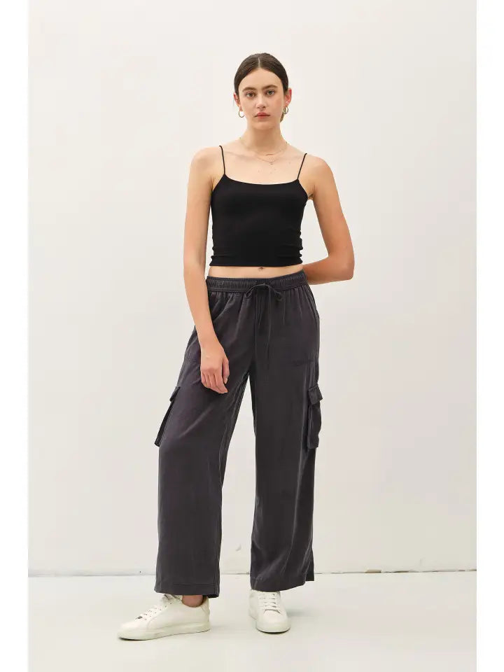 Tencel, Slightly Wide Leg, Cargo Pants, Accordion Pockets, Drawstring Waist, Elastic Waistband, Pull-On, Stretchy Waistline, Inseam: 26 1/2", Rise: 11 1/4".