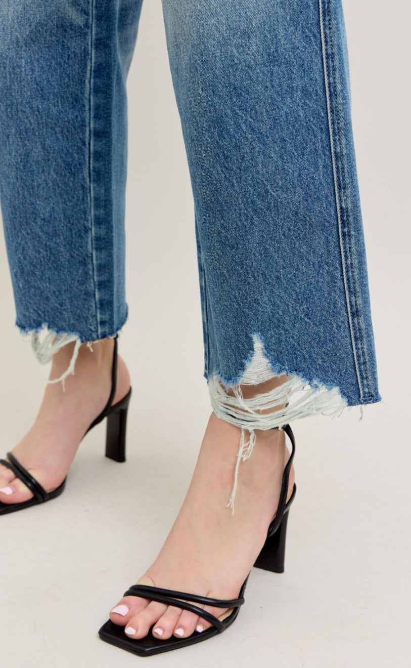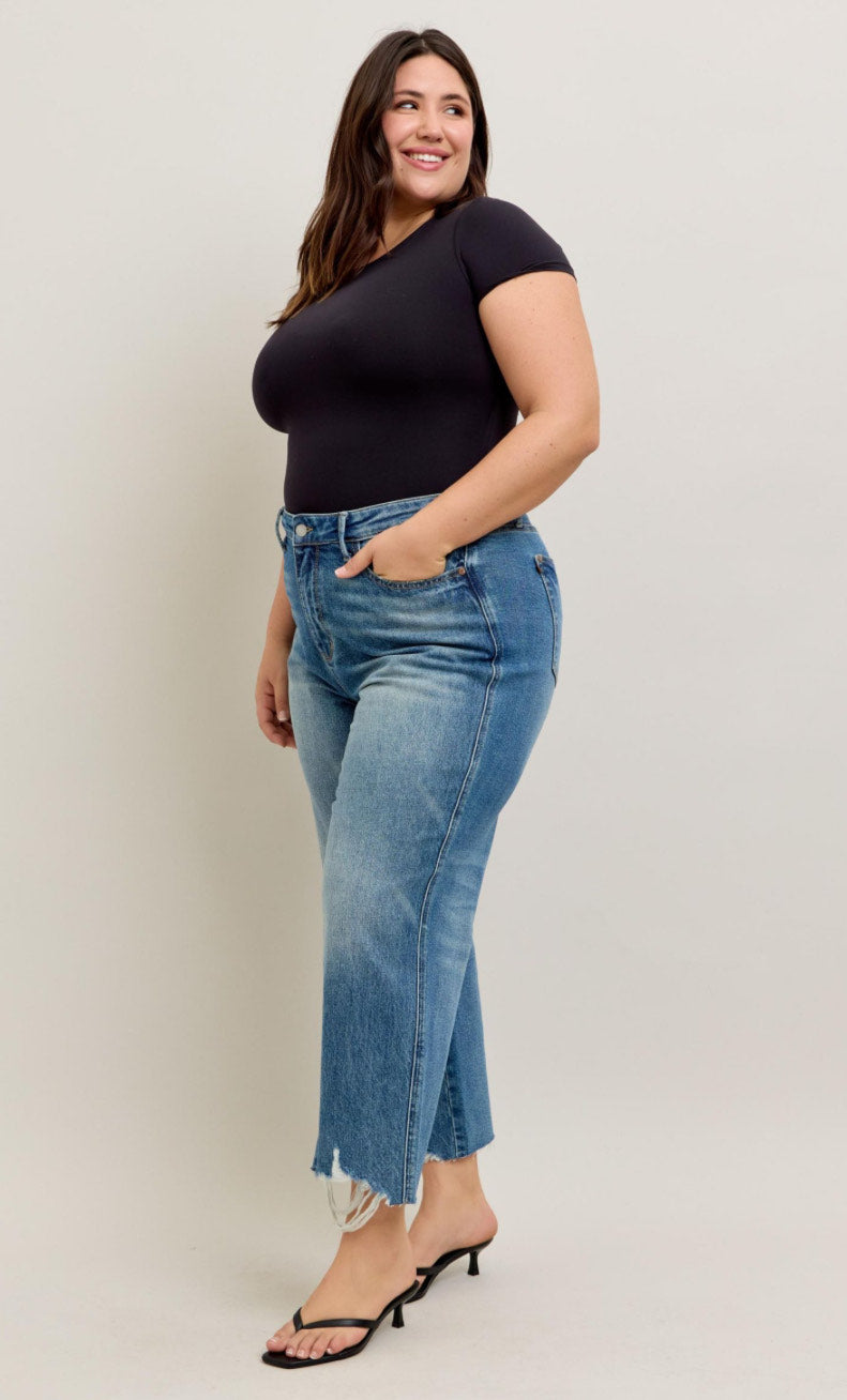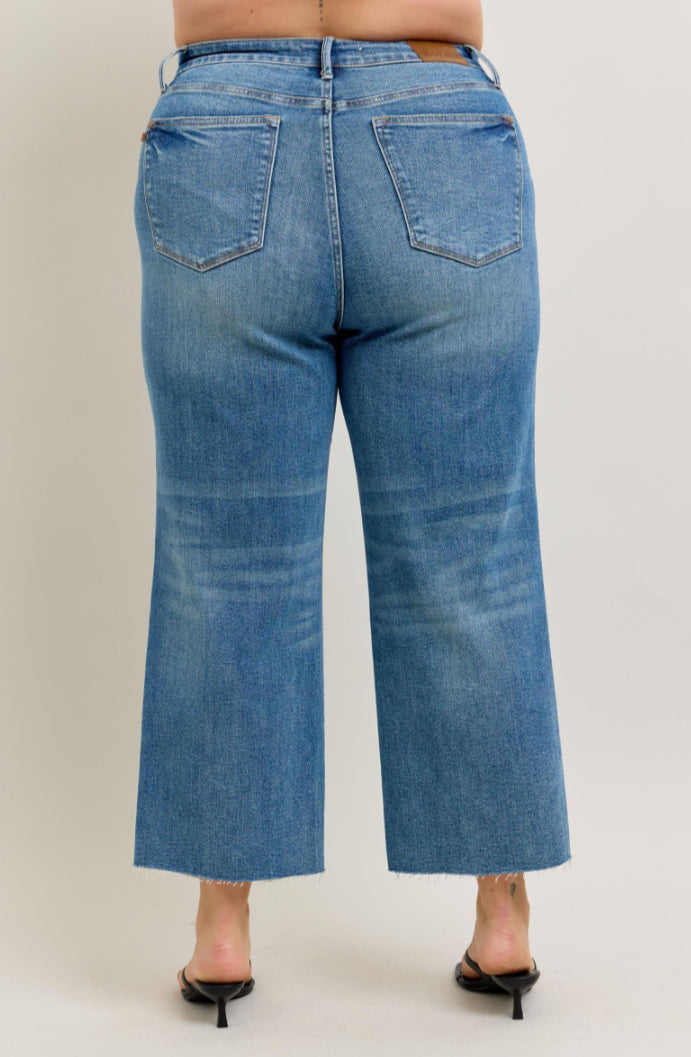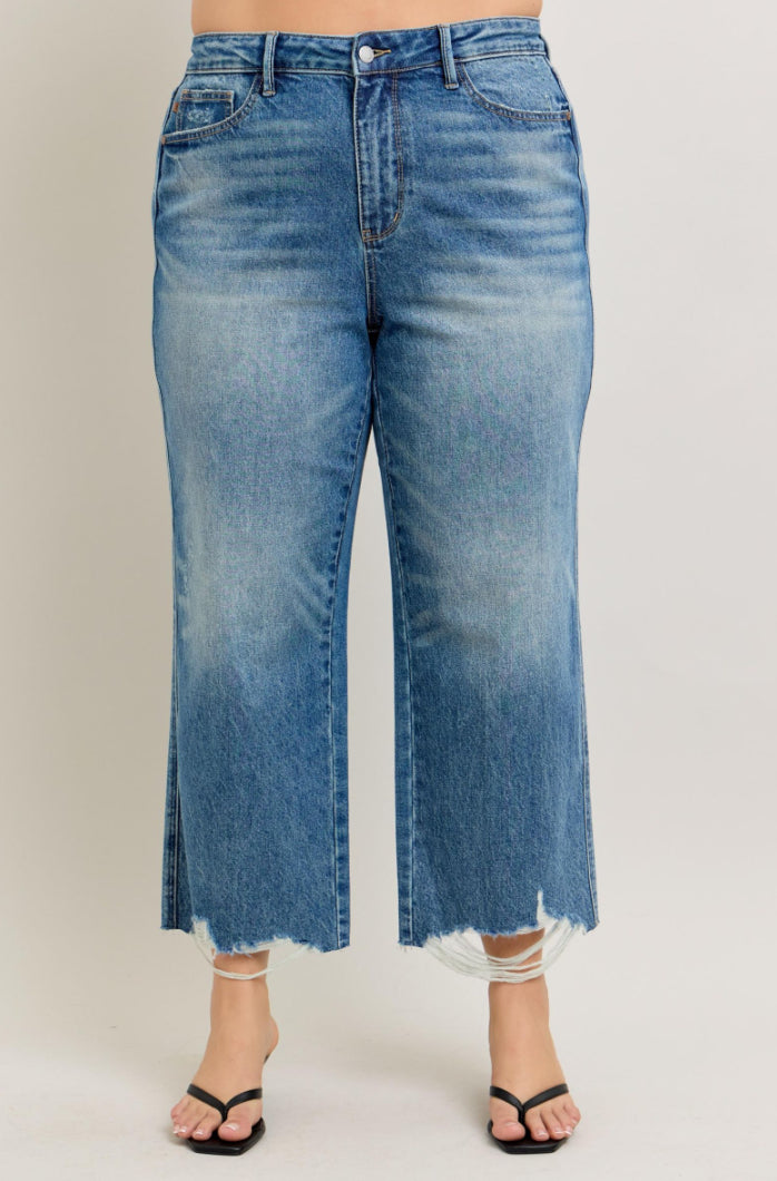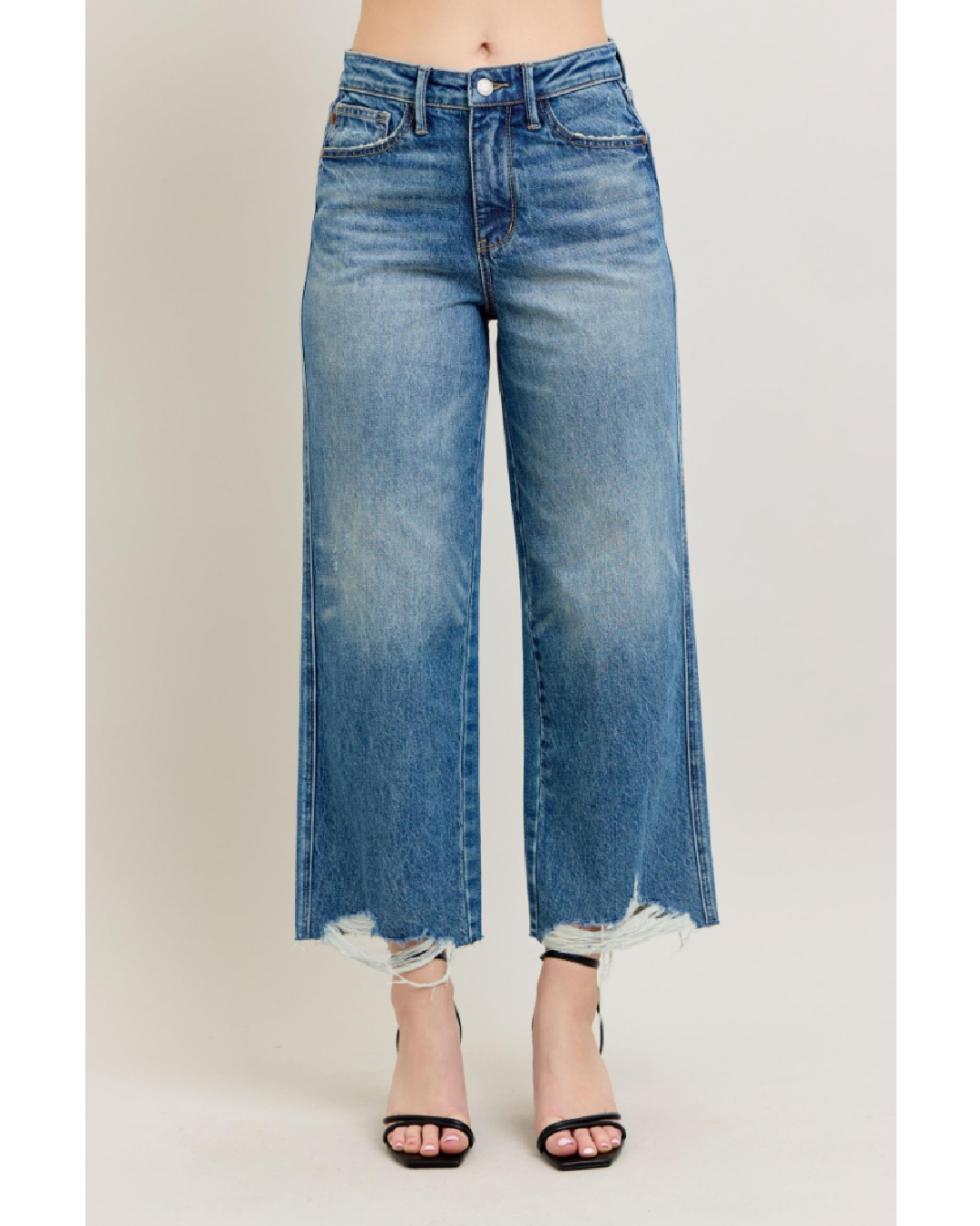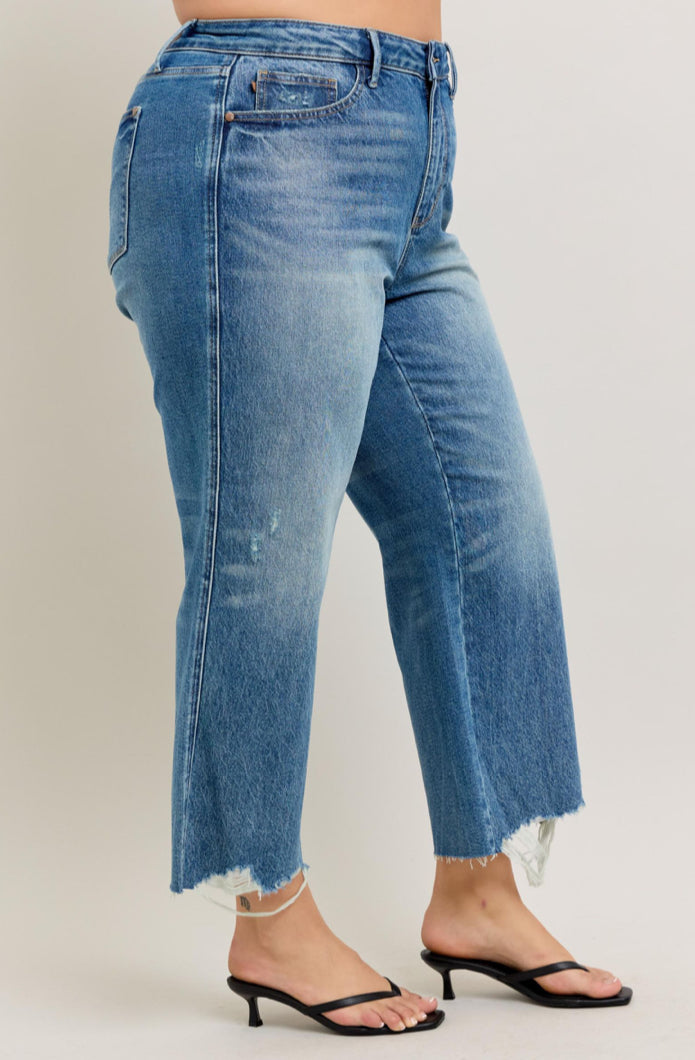 Rigid Magic has a "Rigid" (Firm Fitting) Front with and extra panel of Stretch Back- giving you the best of both worlds! Detailed Destroyed Hem for a trendy look. Wide Leg Crop.