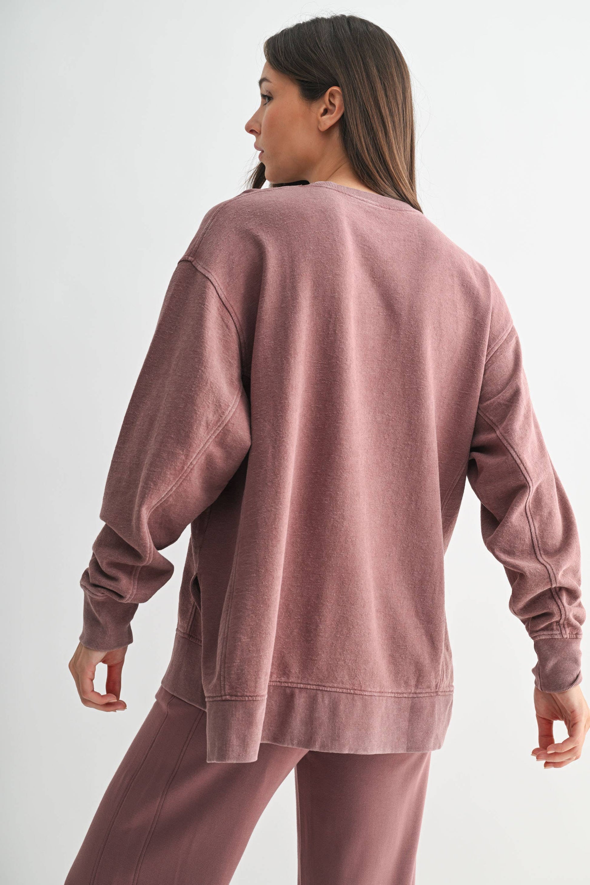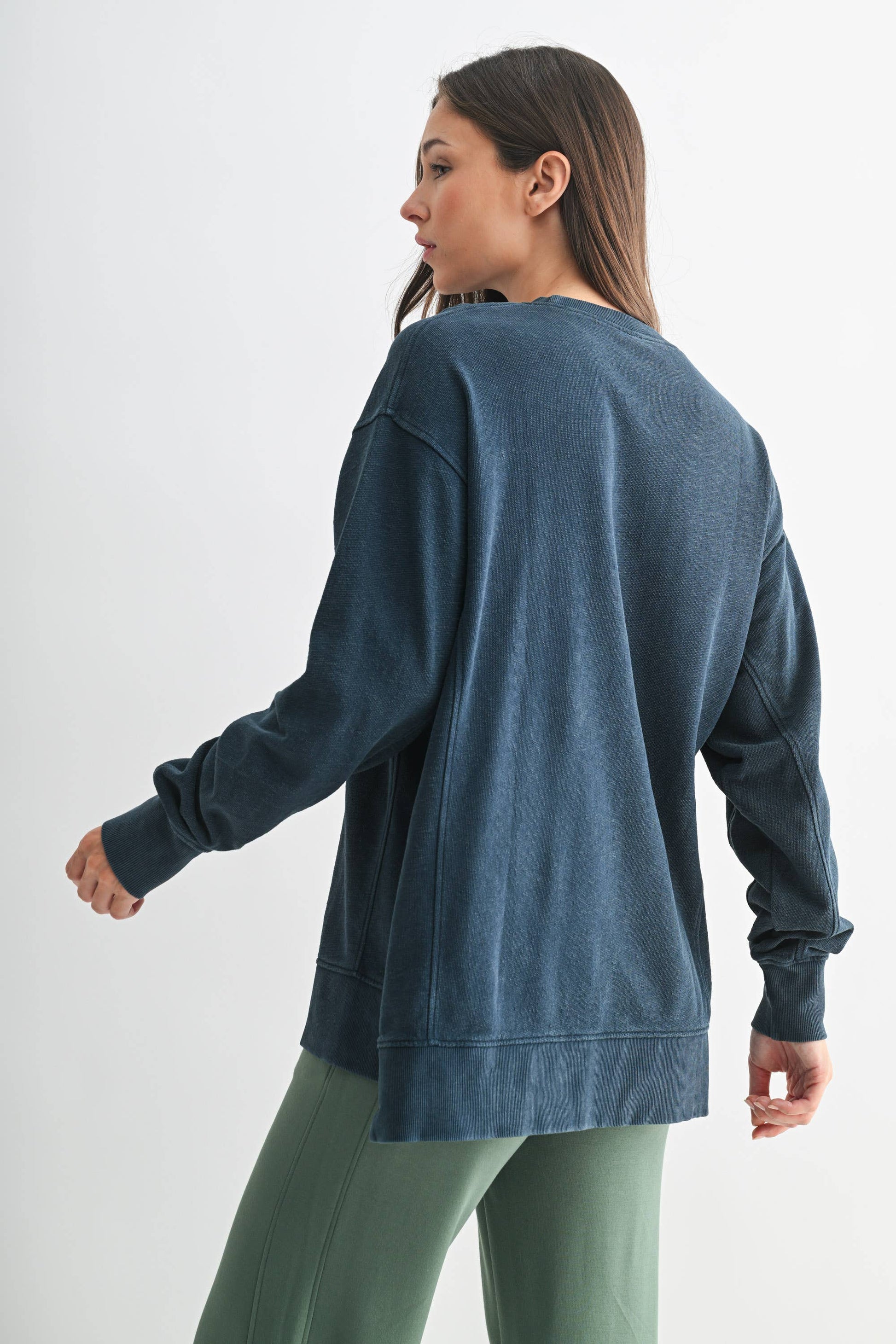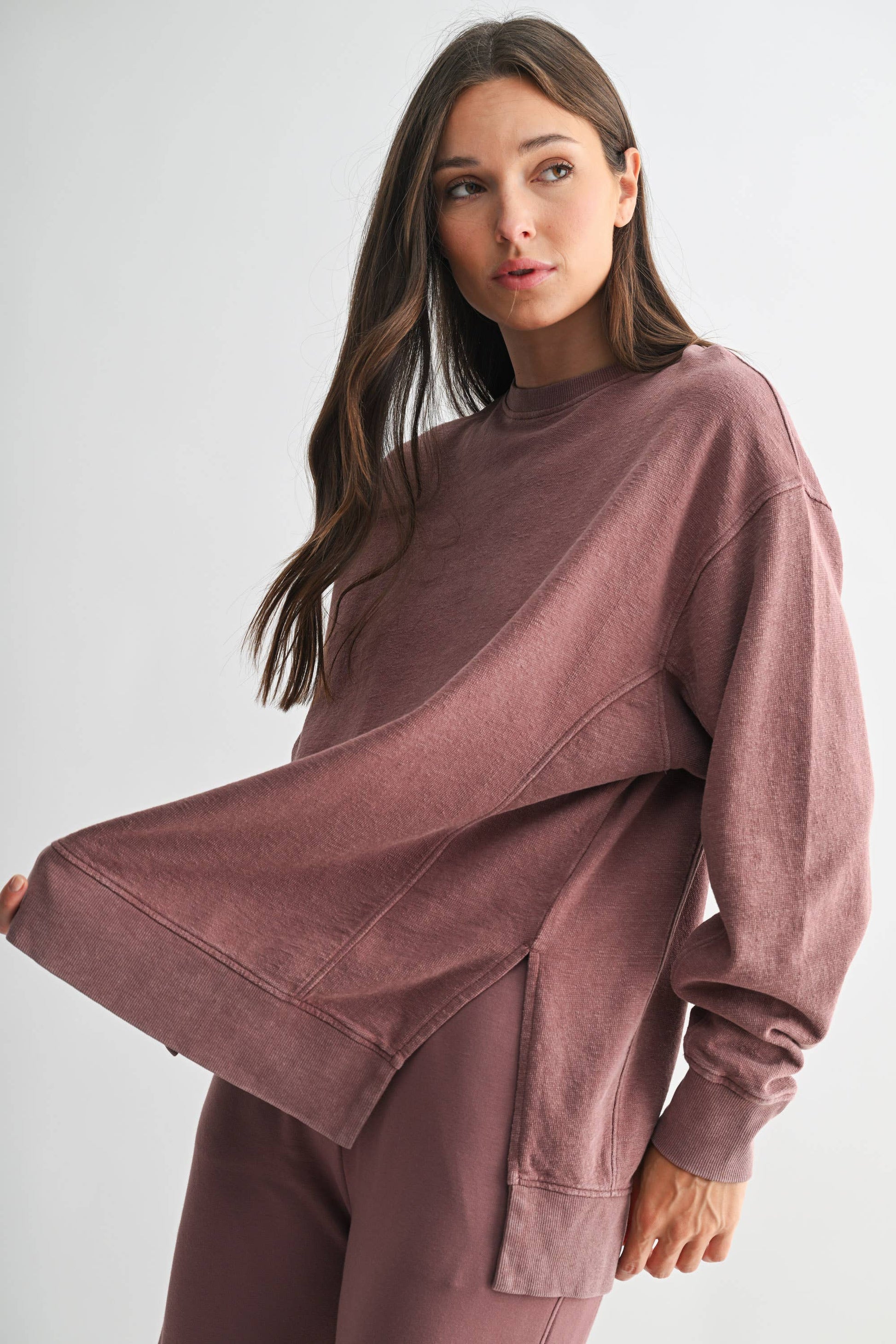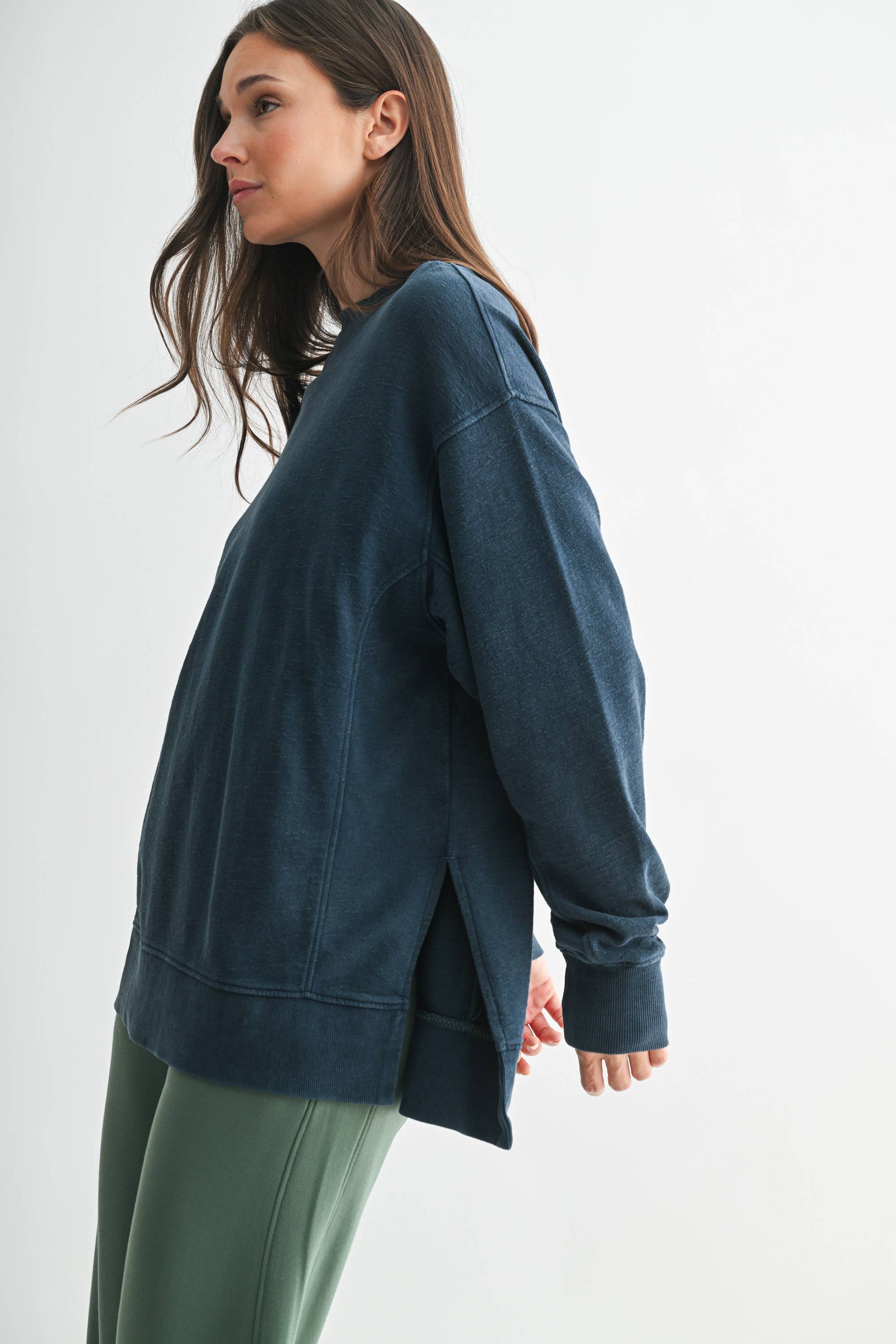 Crafted from 100% cotton jacquard fabric, this boxy long sleeve tee features a mineral wash for a softly faded, worn-in look. Designed with a slight high-low hem and side slits for added shape and ease, it’s finished with ribbed cuffs, hem, and collar for a touch of structure. An elevated essential with everyday versatility.