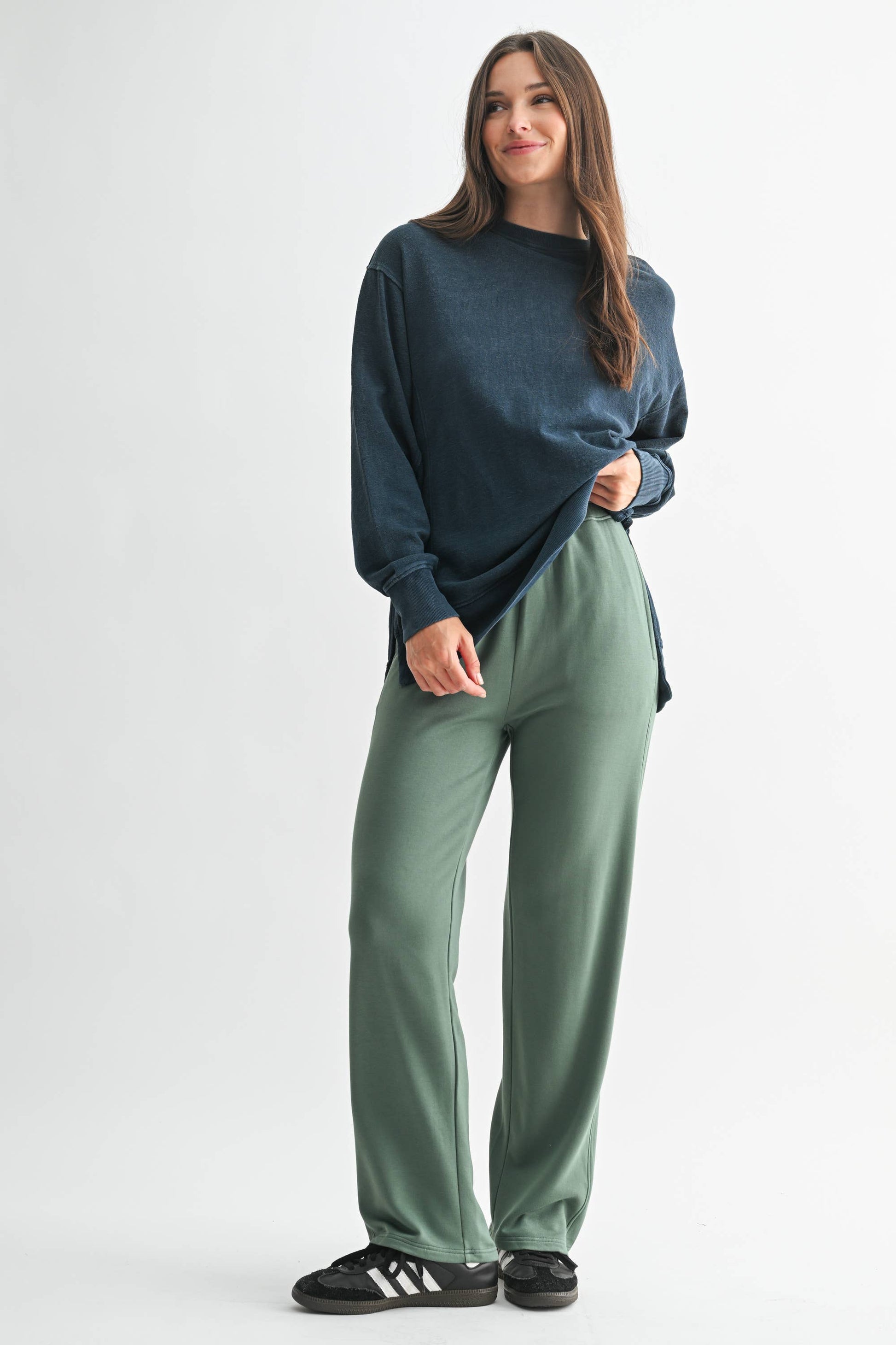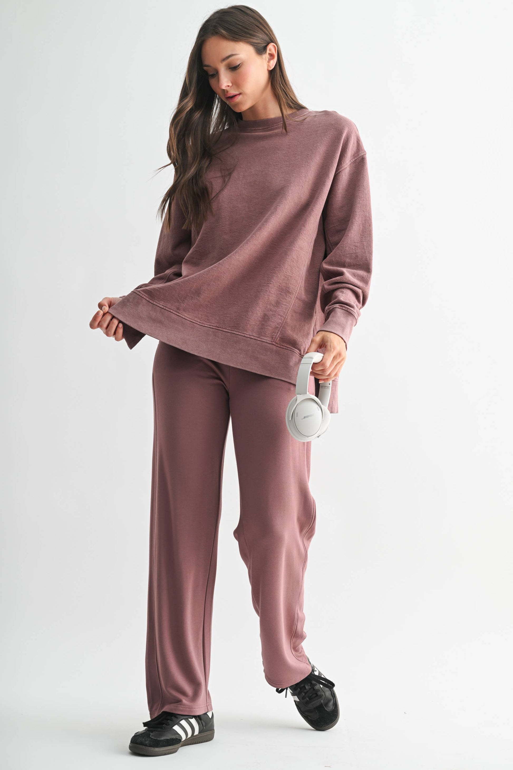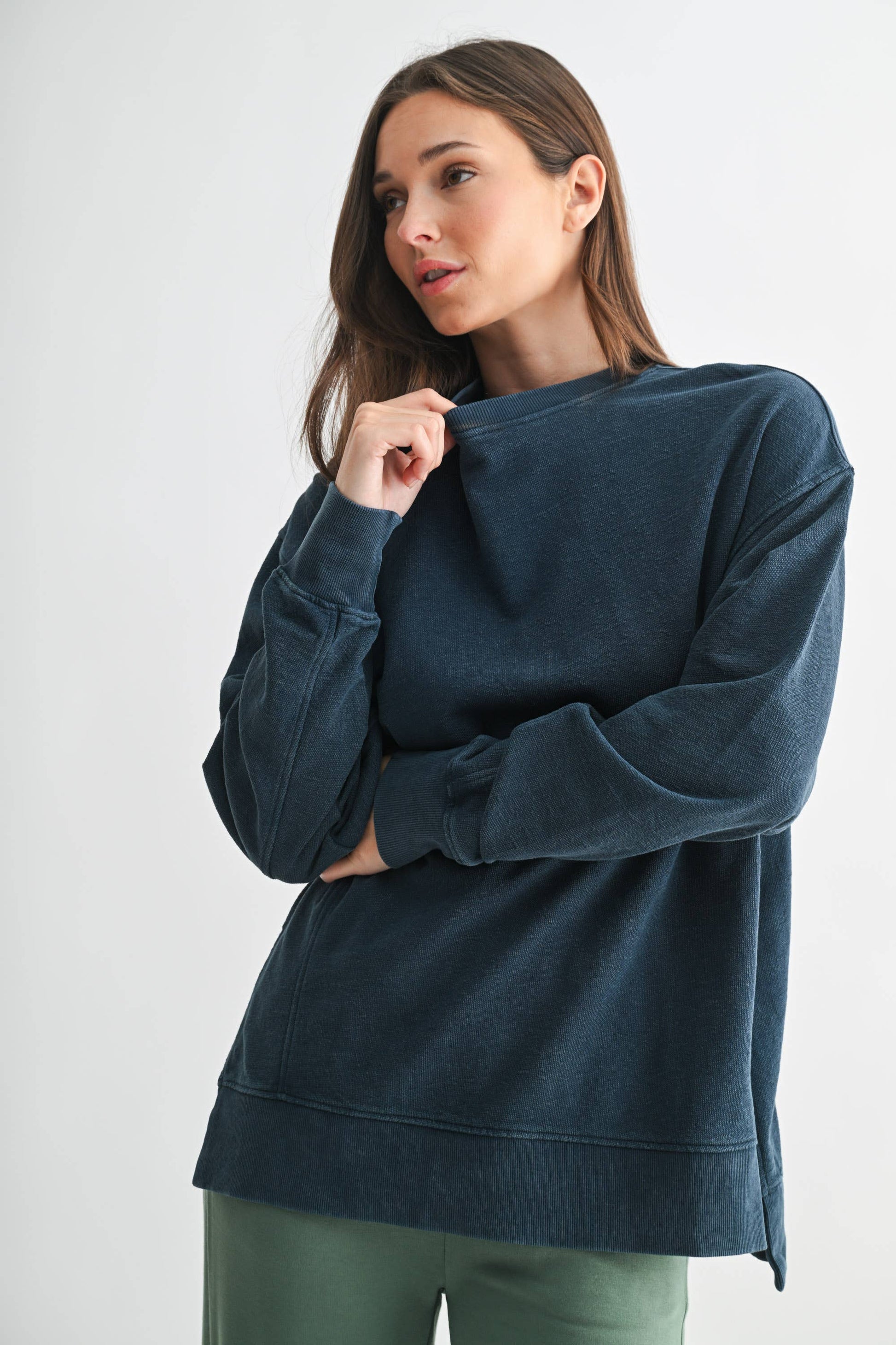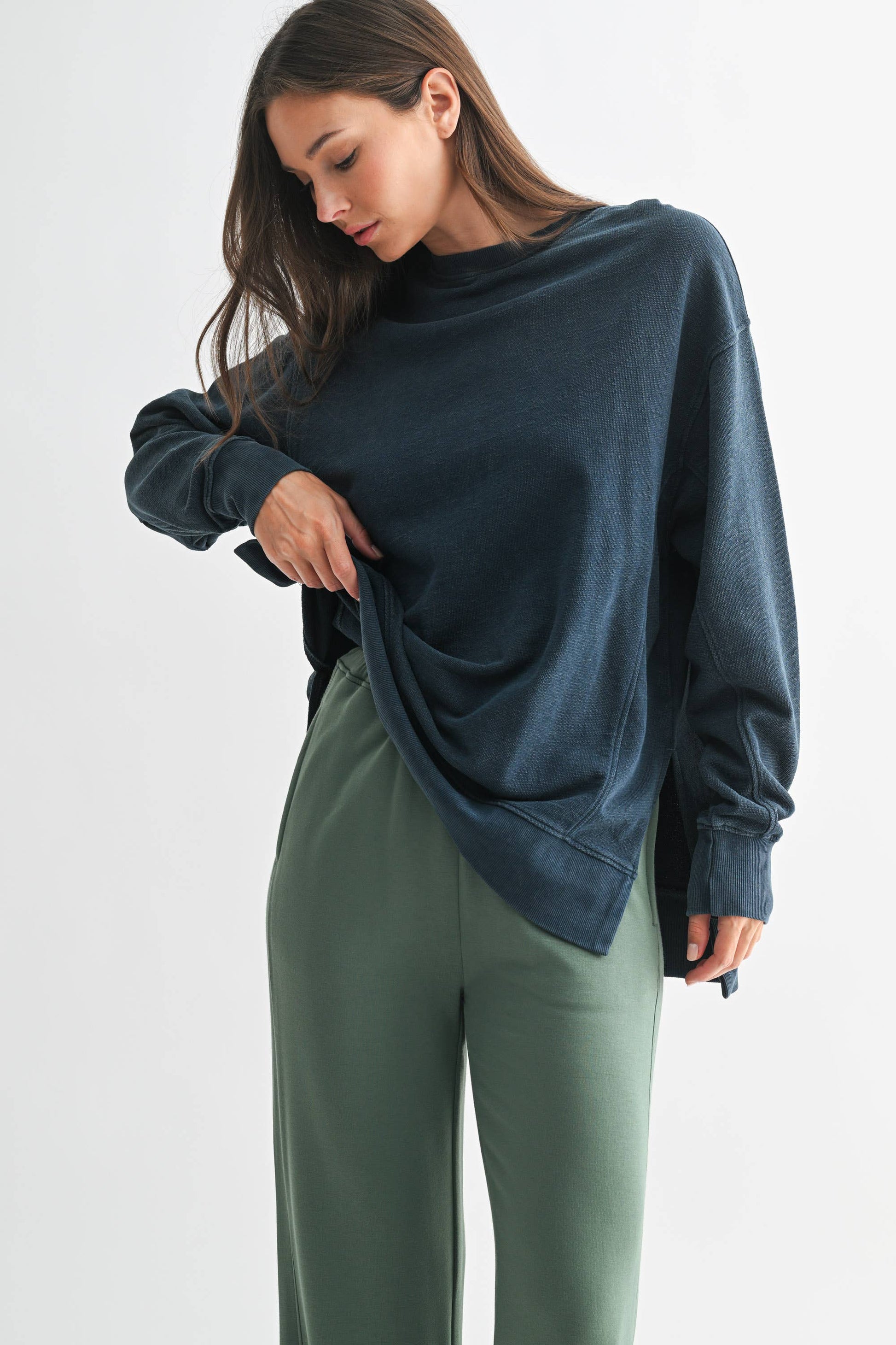 Crafted from 100% cotton jacquard fabric, this boxy long sleeve tee features a mineral wash for a softly faded, worn-in look. Designed with a slight high-low hem and side slits for added shape and ease, it’s finished with ribbed cuffs, hem, and collar for a touch of structure. An elevated essential with everyday versatility.