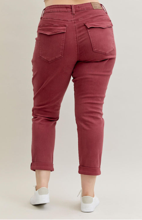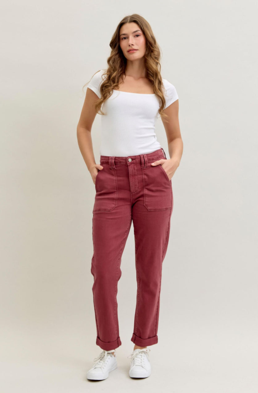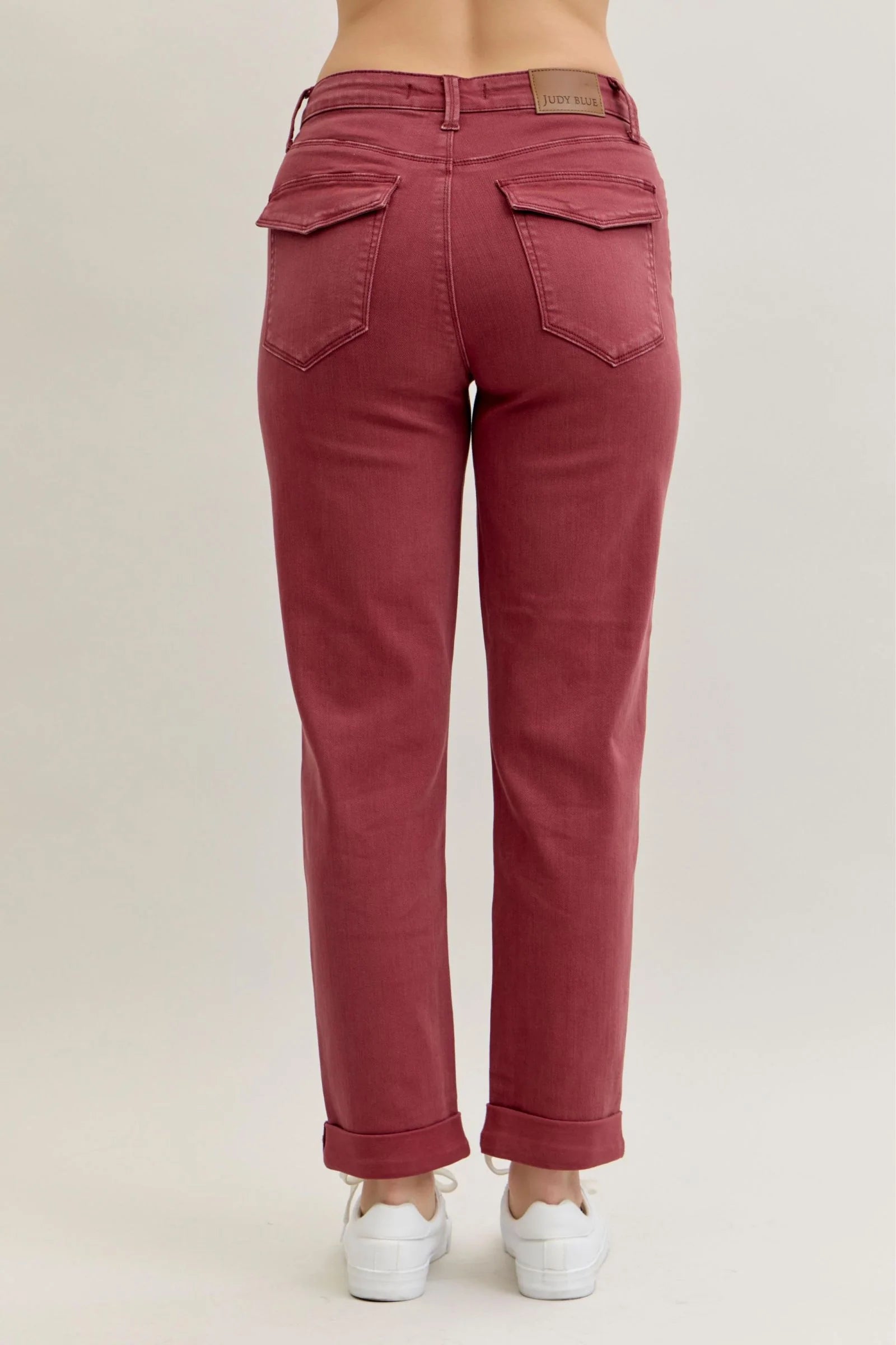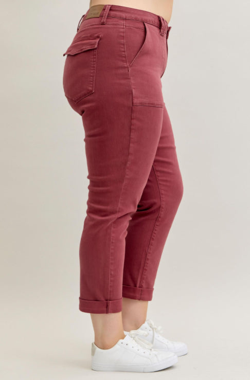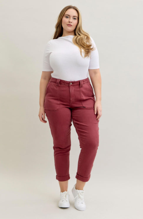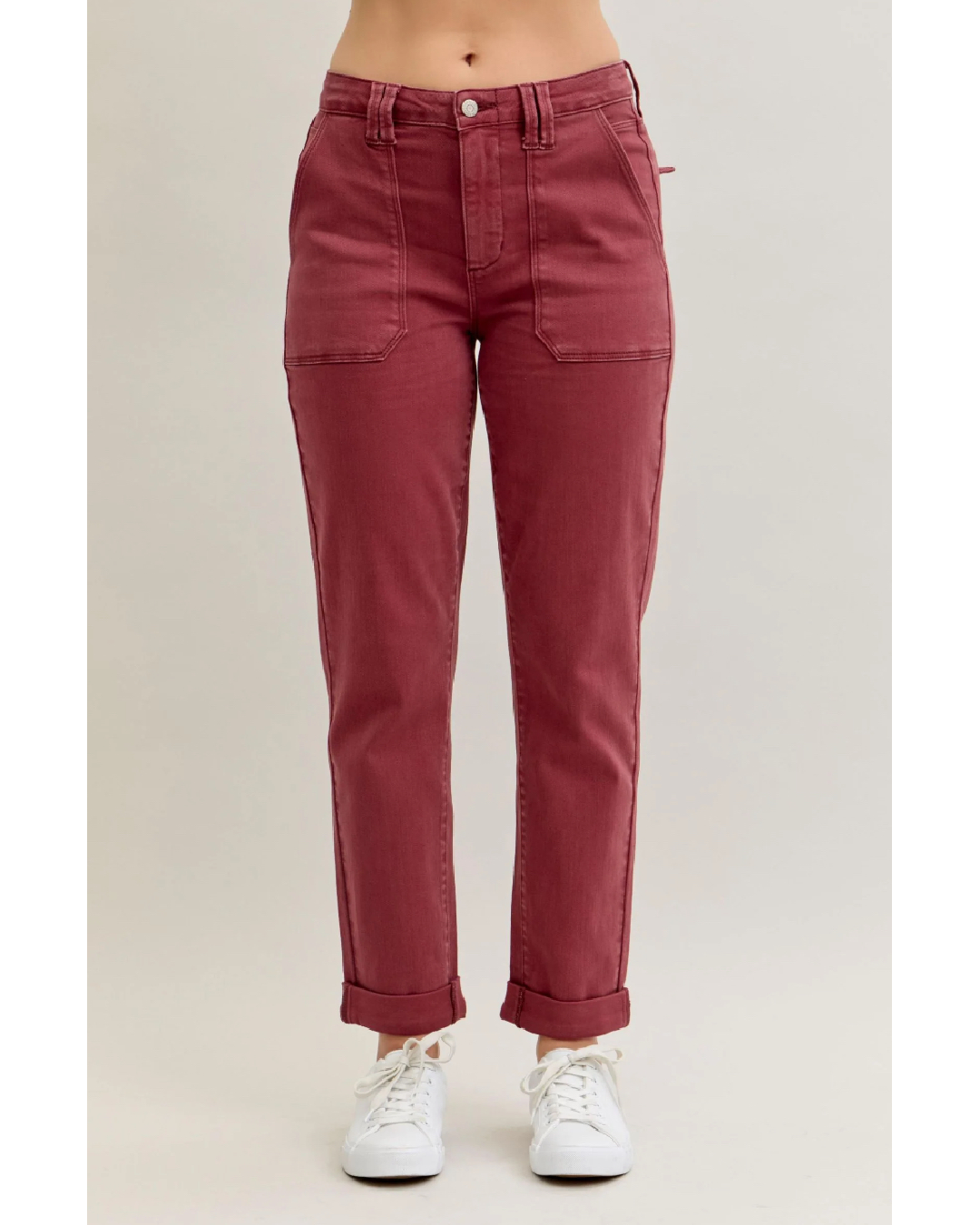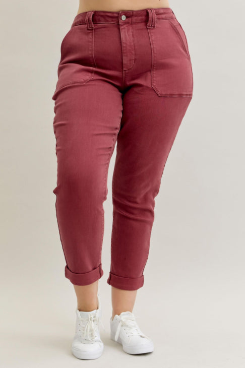 Judy Blue High Waist Aurora Weekender Garment Dyed Burgundy Cuffed Jogger Denim Jeans