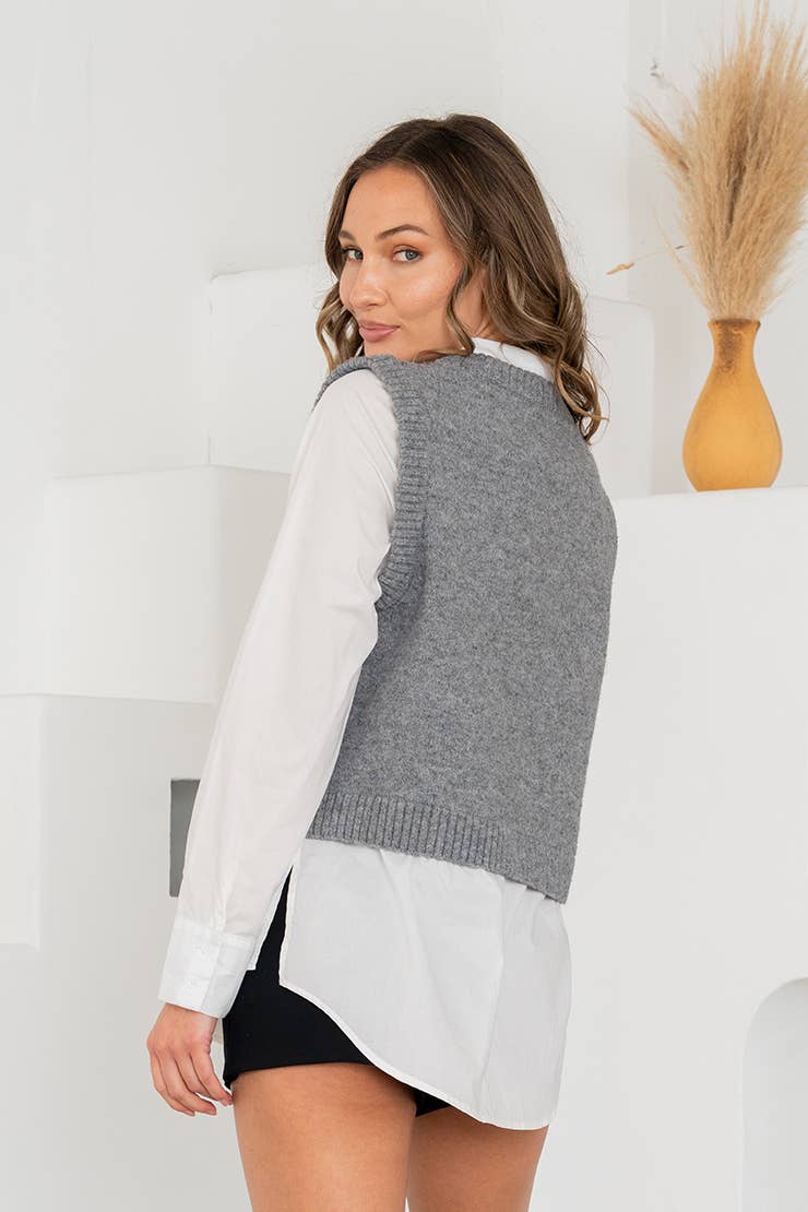 This layered-look shirt vest top features a cozy knit sweater vest overlaying a crisp button-down shirt. The contrast between the soft grey knit and structured white shirt creates a polished yet relaxed silhouette. Finished with ribbed trim and a curved hem, it's perfect for effortlessly chic styling.