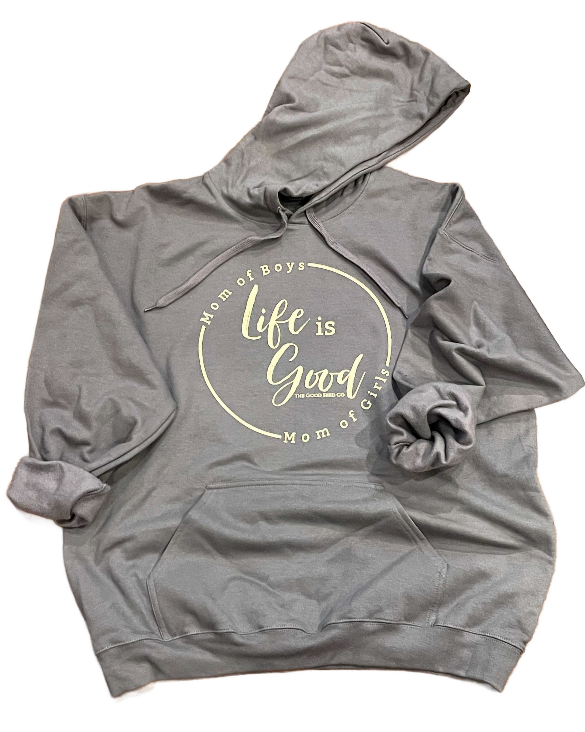 This "Mom of Boy & Mom of Girls- Life is Good" Hoodie is from The Good Seed Co.
