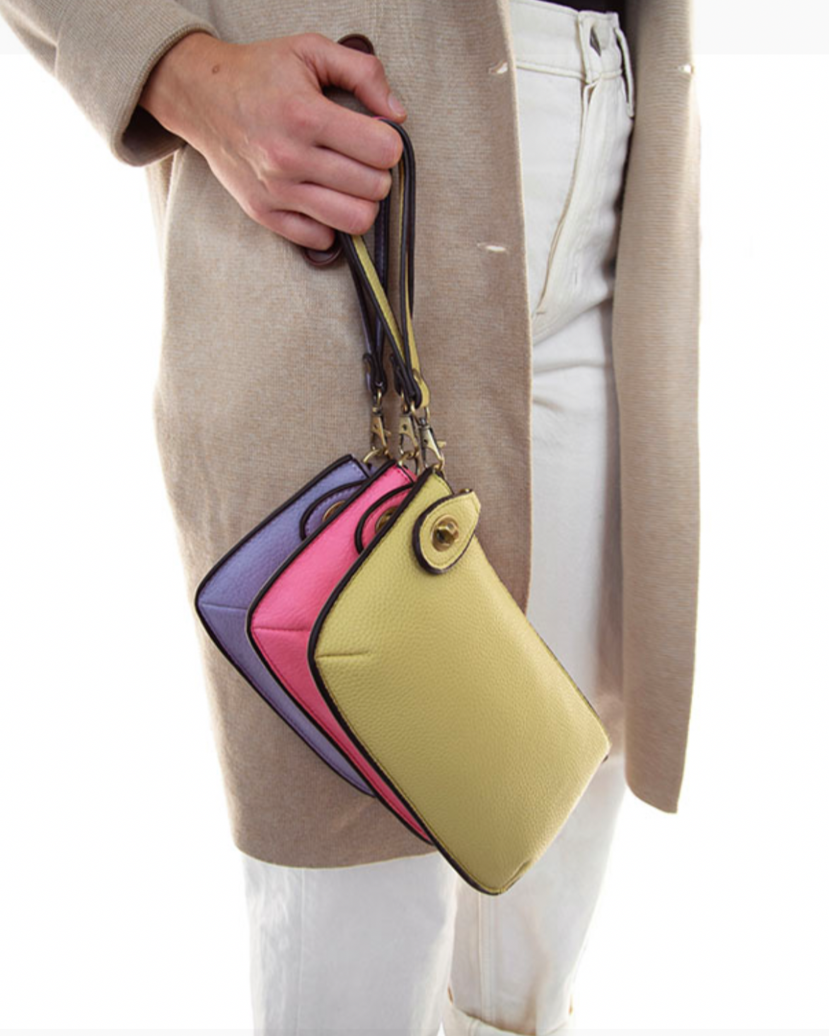 Our most popular bag, this mini clutch in its fresh colors and sleek silhouette is as gorgeous as it is versatile. Features include a polished turn lock, six card slots and interior zipper for change. Can be styled in many ways, with removable straps for alternating between wallet, cross body and wristlet.