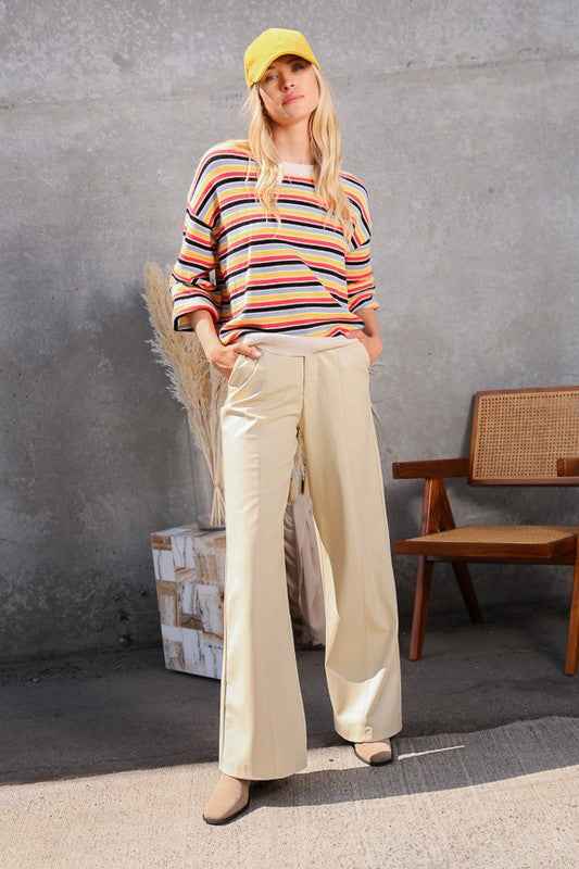 This long-sleeve multi-color striped sweater top is a vibrant and fun addition to your wardrobe. Featuring bold, eye-catching stripes in a variety of colors, it adds a playful pop to any outfit. The soft, lightweight fabric ensures comfort while keeping you cozy, making it perfect for layering or wearing on its own. With a classic round neckline and a relaxed fit, this sweater top effortlessly combines style and comfort. Ideal for pairing with jeans, leggings, or skirts, it's perfect for casual outings, weekend get-togethers, or adding a splash of color to your everyday look.