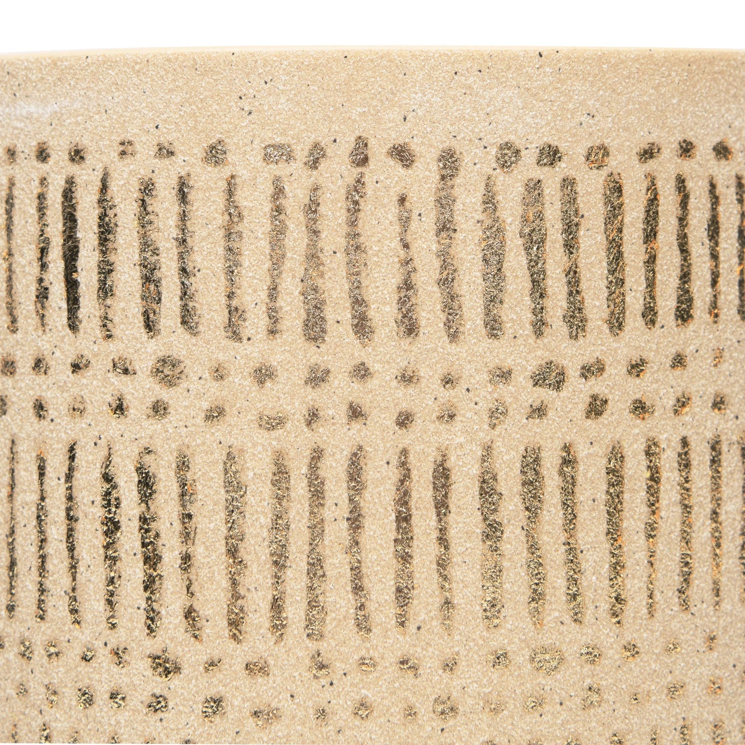 These stoneware planters has a beautiful gold design across a sand colored glaze. The design is repetitive lines and dots, adding a fun and unexpecting design to the pots. Place them on a table in any living space to add a sense of calm and comfort. The planters hold 5 inch and 3 inch pots.