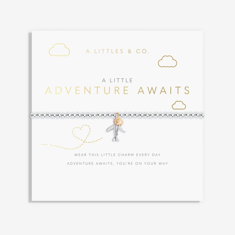 Our A Little 'Adventure Awaits' Bracelet features a captivating design that will dazzle with every movement. Featuring a stretch-bead style and a beautiful silver-plated charm, wrapped around one of our stylized cards and framed by a sweet poem. It's oh-so special.