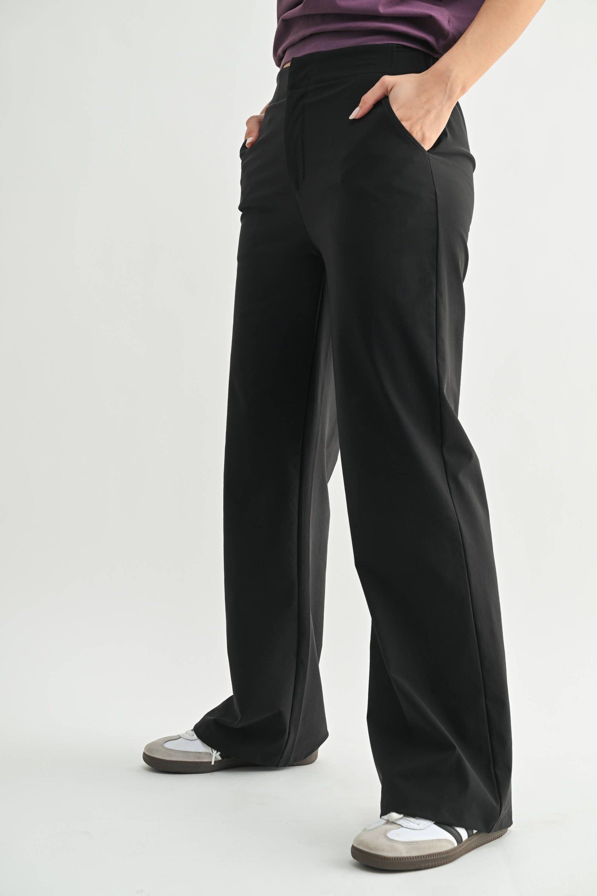 Meet your new go-to: the BreezeBound Wide Leg Pants—perfect for summer and beyond. Made from a nylon-spandex blend, these pants are cool to the touch, breathable, and moisture-wicking, keeping you fresh and sweat-free all day long. The sleek design features a zip-up front with two metal clasp closures, ensuring a minimal, streamlined look without any bulky buttons. The wide-leg fit provides ample room and effortless comfort, making them ideal for everything from office days to weekend outings with friends. Look polished, feel comfortable, and stay cool—no matter where the day takes you.