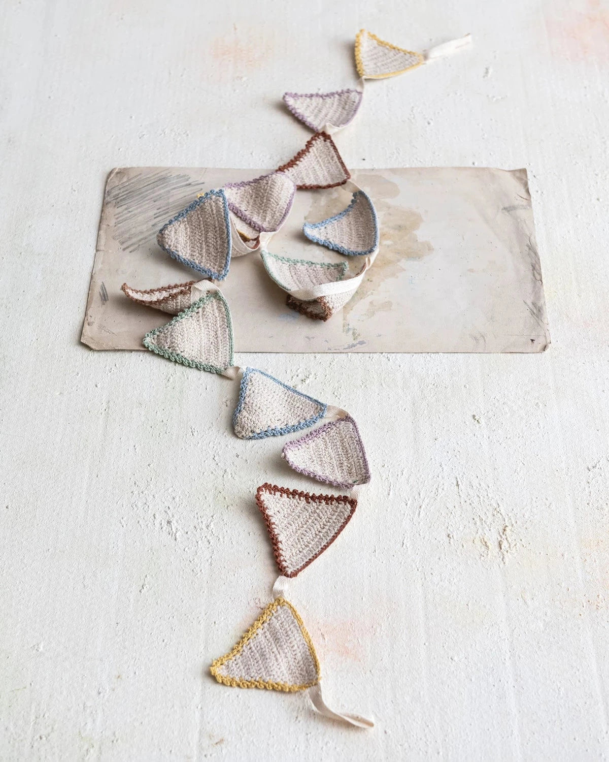 The hand-woven cotton crocheted pennant garland in a vibrant multicolor design is an ideal decorative piece to add a touch of whimsy and charm to any space. Made from high-quality, soft cotton, this garland measures 72 inches long, providing ample length for versatile styling options. Each pennant on the garland is meticulously hand-woven and crocheted, showcasing the artisanal craftsmanship that goes into its creation. The multicolor palette adds a playful and festive atmosphere, making it perfect for casual gatherings or parties. Whether it's strung across a mantel, draped along a wall, or hung in a child's room, this garland effortlessly elevates any area with its bohemian chic aesthetic. Furthermore, being made from natural materials contributes to sustainability and showcases ethical production practices—making it an excellent choice for conscientious consumers seeking both style and substance in their decor purchases.