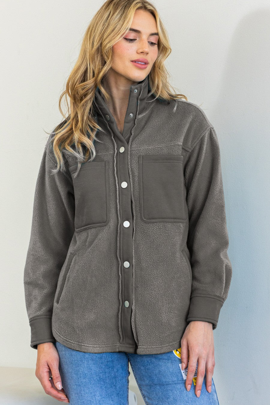 High neck fleece jacket featuring front snap button closure, bust pockets, side pockets and long sleeve with cuff. Total Length: 27" Contents: 73% Polyester, 27% Cotton.