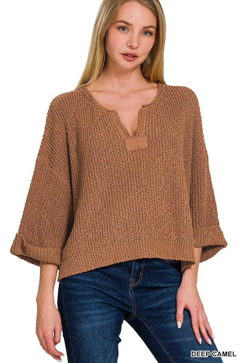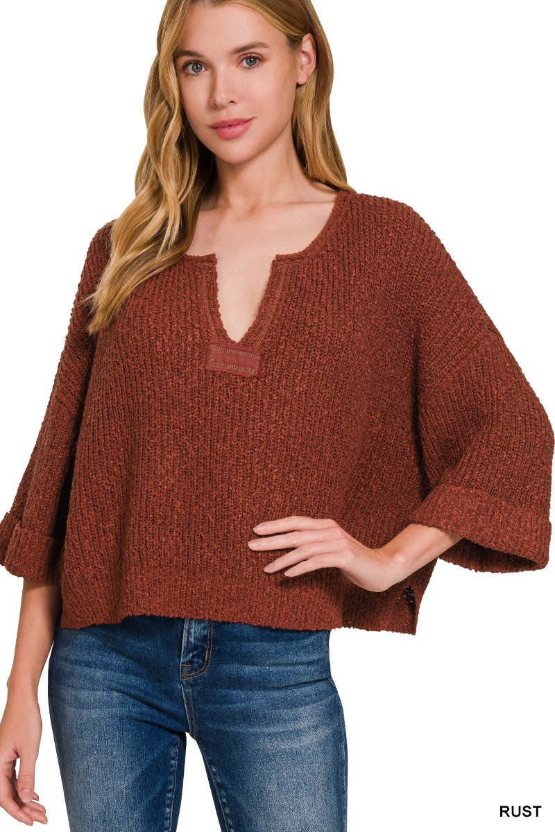 Front Slit Patch Folded Sleeve Pullover