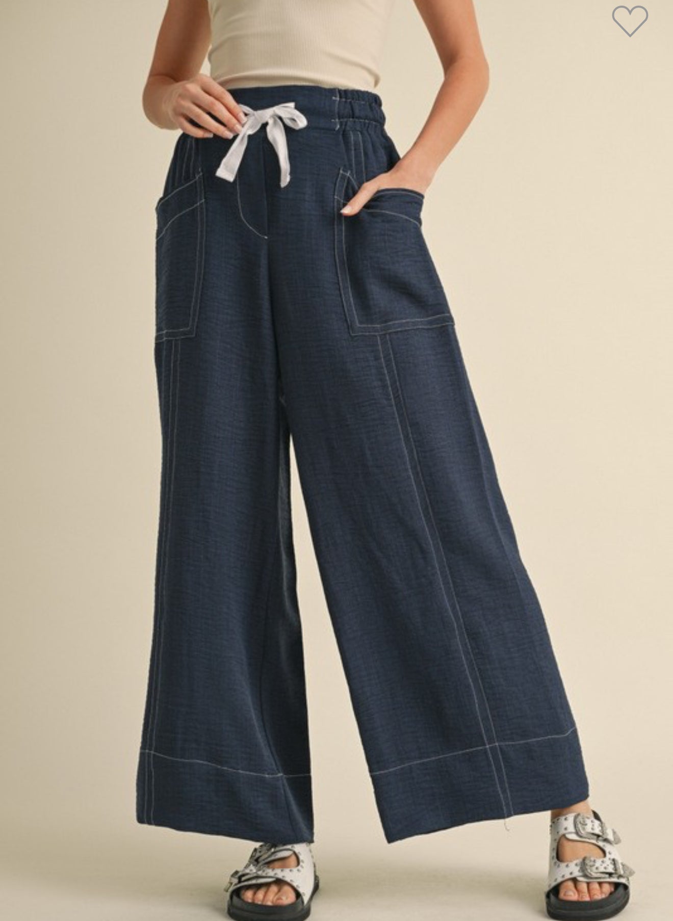 Machine wash wide legs pants with drawstring waistline, front slant pockets, back patch pockets, and contrast stitching edge.
