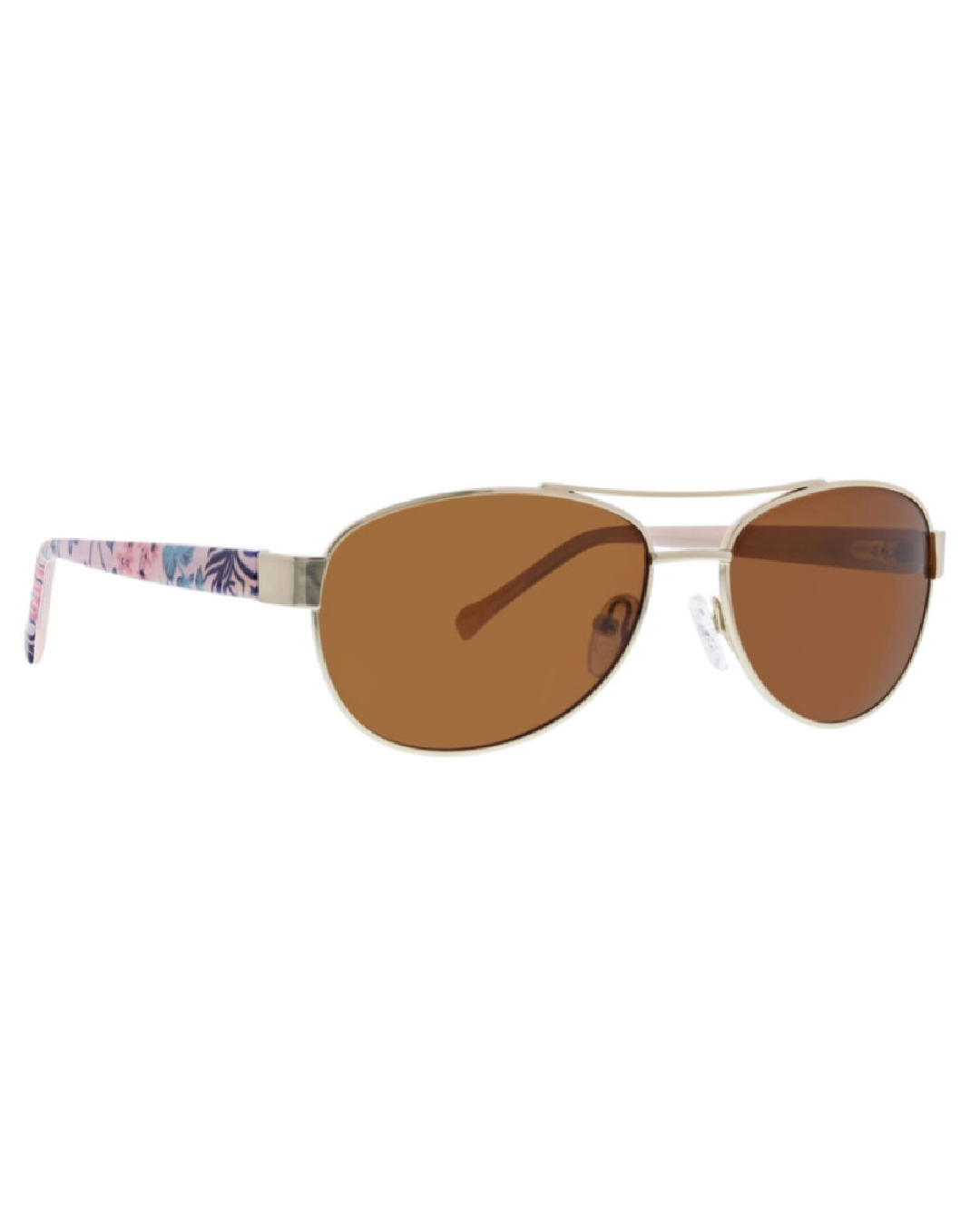 Dare to stand out in Marlene, a bestselling classic in Vera Bradley's sunglasses collection that perfectly encapsulates feminine design in the beloved aviator style. This frame pops with a clean edge stainless steel décor in a polished gold finish, and a fun, awe-inspiring twist of vibrant colors on the temples showcasing either Paradise Coral and Parisian Bouquet. Specifically designed with women's silhouettes and shapes in mind, Marlene offers polarized lenses and an irresistible blend of sophistication and joy, making them the perfect companion for those seeking a happy, stylish twist to their everyday look.