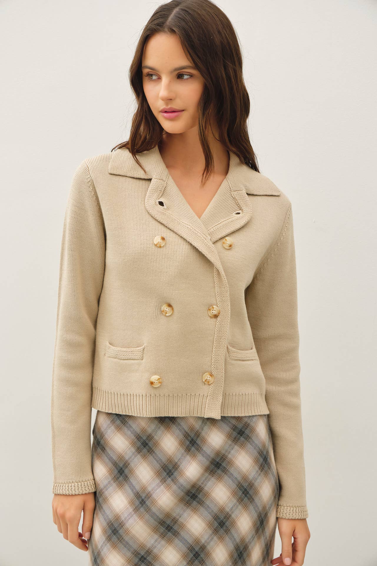 Double breasted hip-length 100% cotton sweater jacket with light tortoise buttons.
