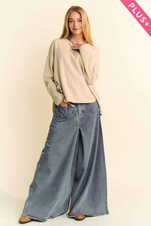 PLUS SOLID LONG SLEEVES, ROUND NECK, SIDE SLIT, DETAILED PULLOVER DROPPED SHOULDER LOOSE FIT TOP
