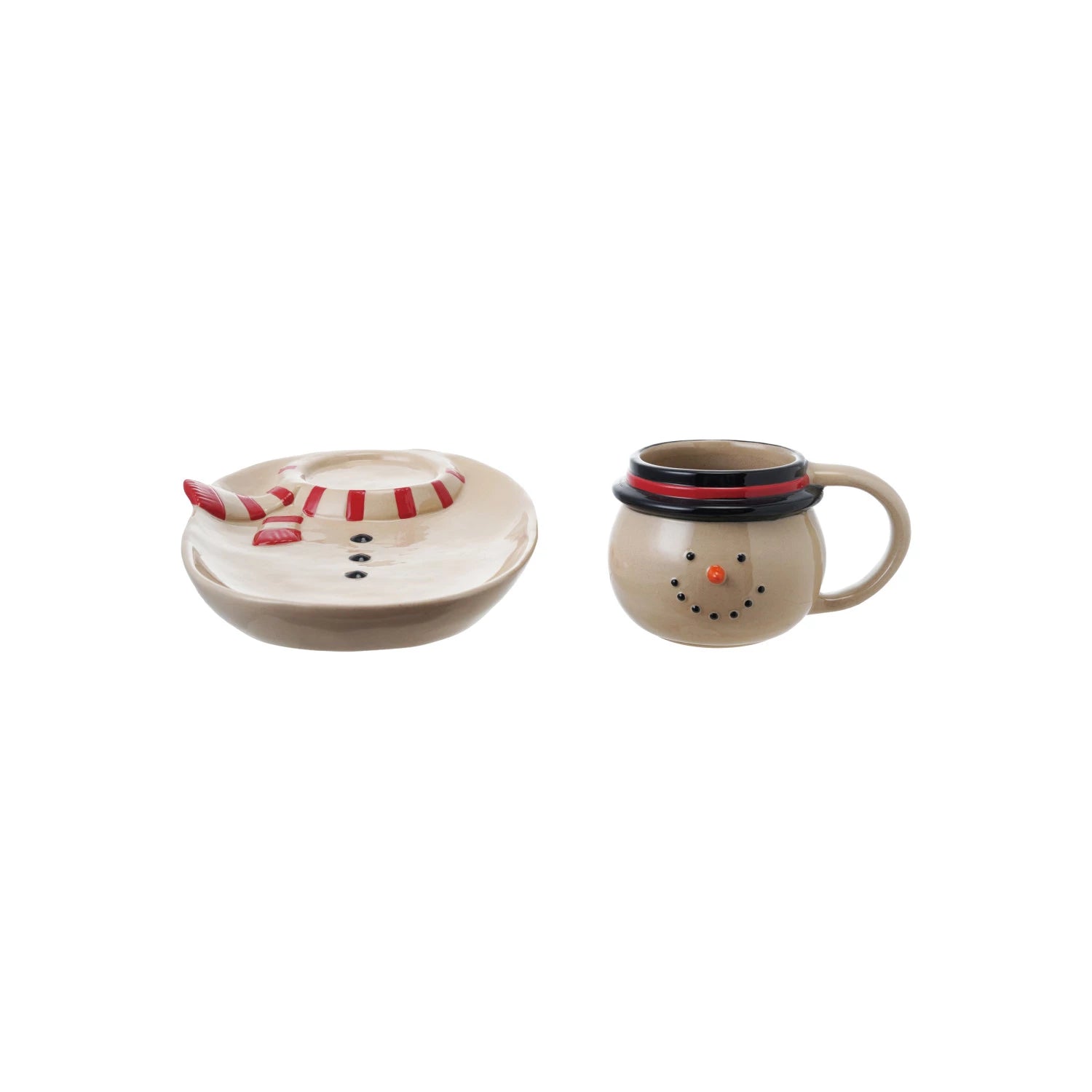 4" Round x 3"H 12 oz. Hand-Painted Stoneware Snowman Mug w/ 9"L x 6"W Platter, Multi Color, Set of 2