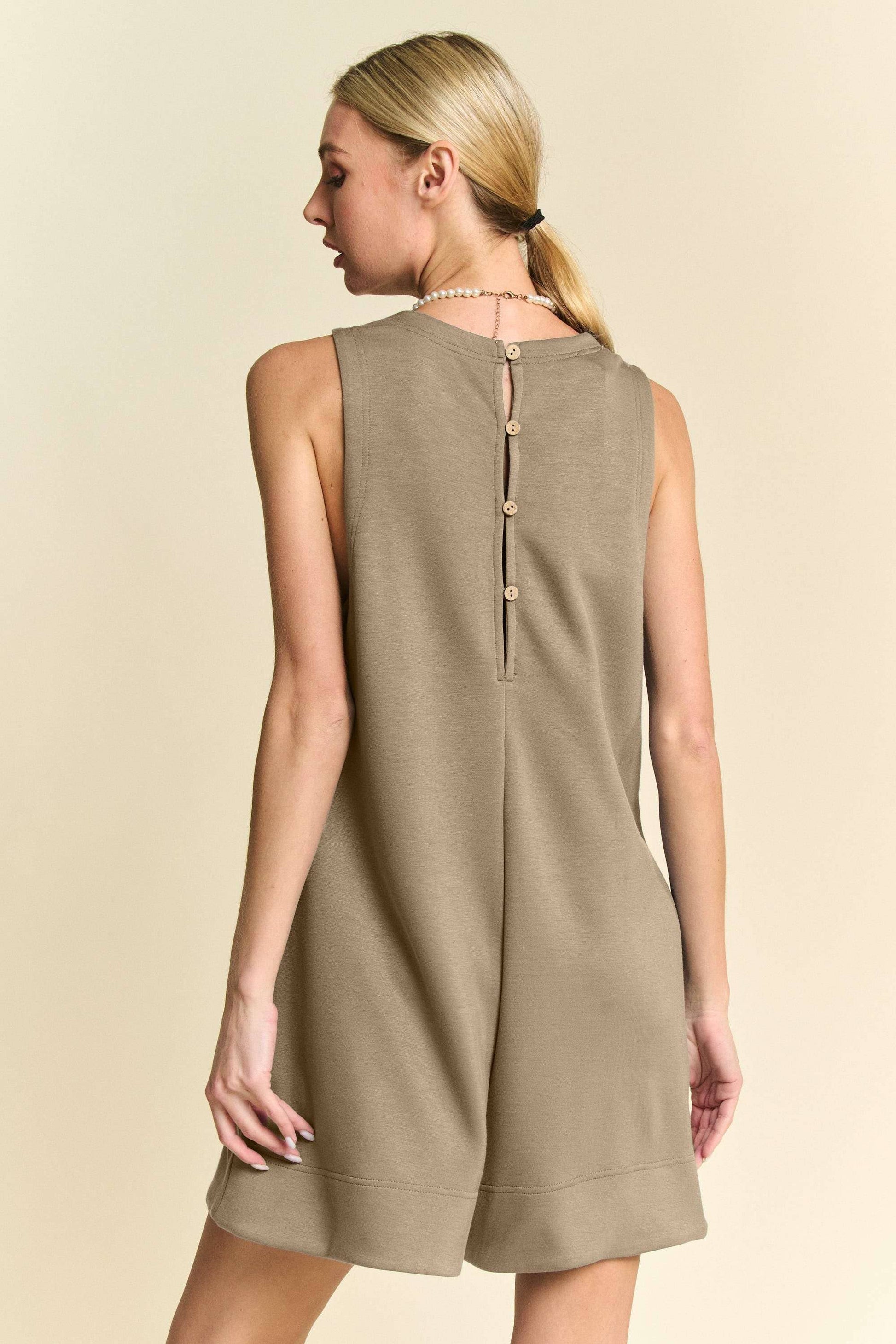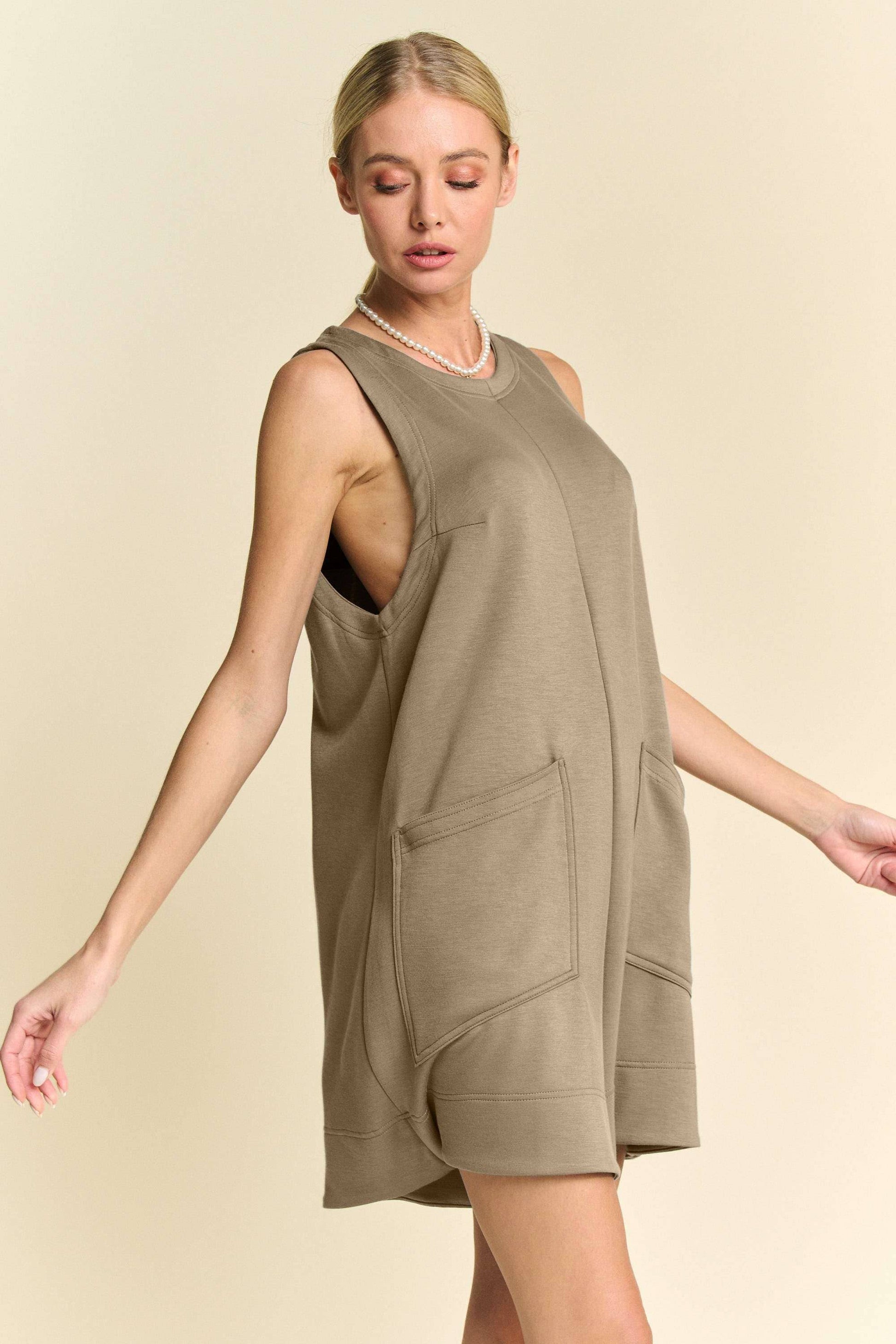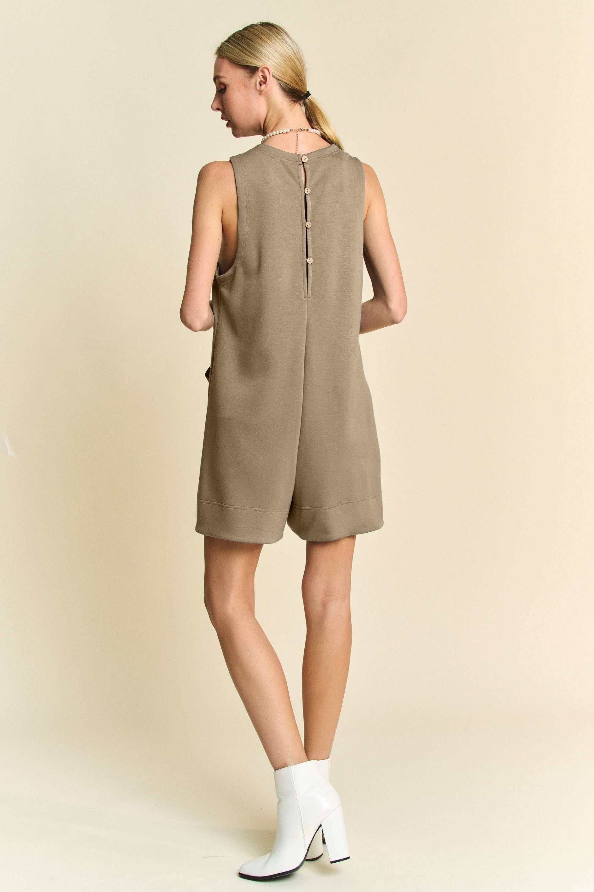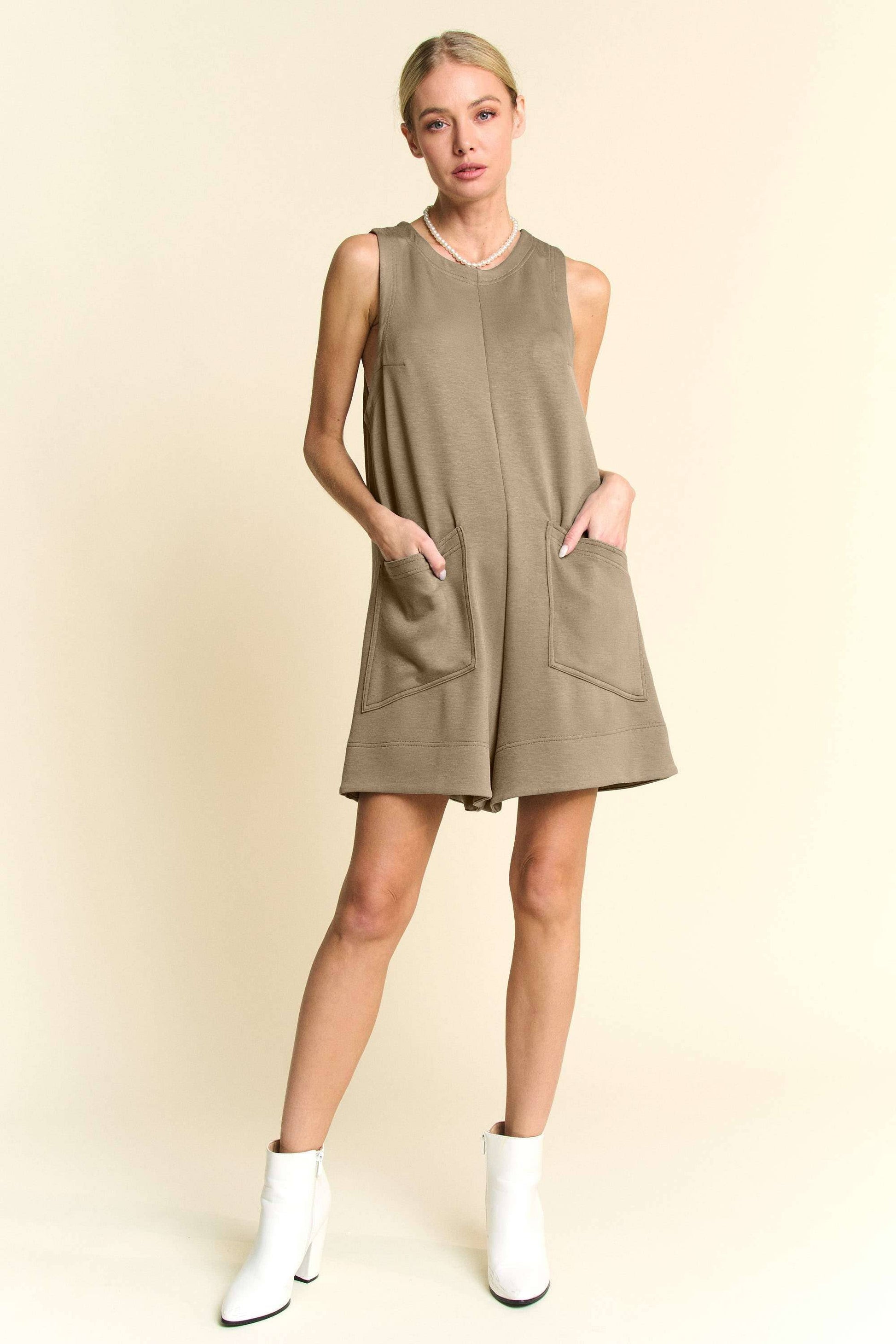 Soft knit crew neck front pouch pockets wide opening leg comfy romper