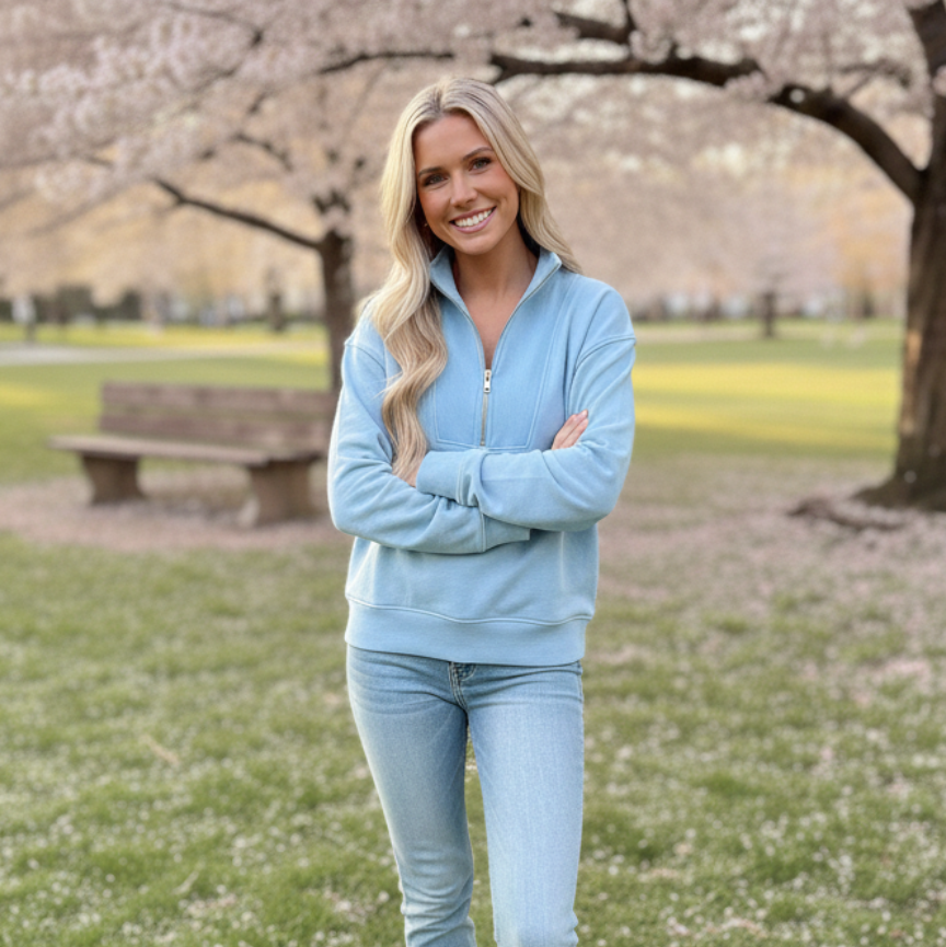 Isabella Half-Zip Sweatshirt – Spring Essential The Isabella Half-Zip Sweatshirt is the perfect lightweight layer for spring and transitional weather. Designed with a relaxed, easy fit and a soft fleece lining, this sweatshirt delivers cozy comfort without feeling heavy—ideal for everyday wear, travel, and casual styling. Featuring a classic half-zip neckline, the Isabella can be worn zipped up for warmth or open for a laid-back look. The breathable, light fleece interior keeps it comfortable from morning errands to cool evenings,.