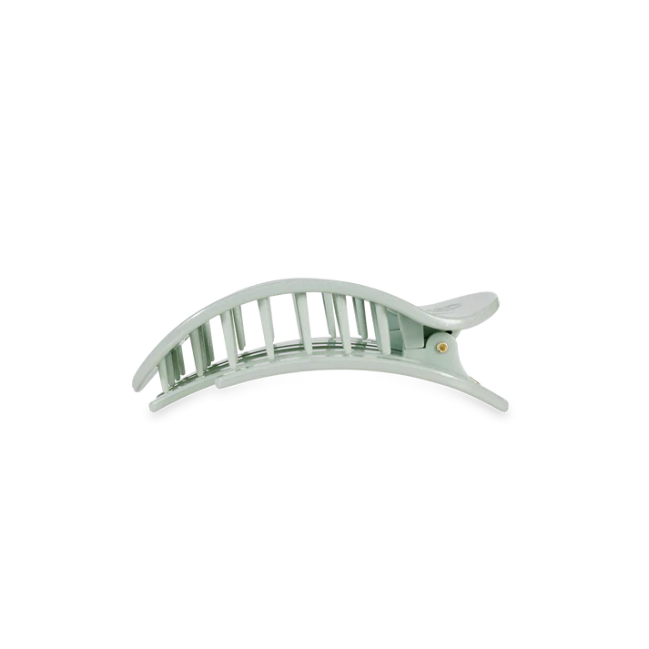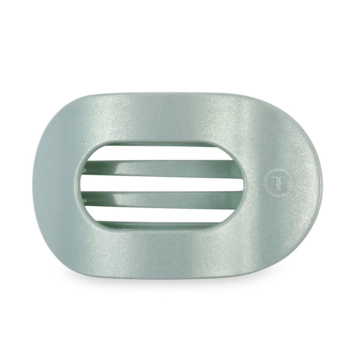 Lay flat and relax with the new TELETIES Dew Drop Small Flat Round Hair Clip in Shimmering Green. This hair clip is designed to allow you to lay back flat, do yoga, or sit comfortably in a seat with a headrest, and it is made with the same material that is nearly unbreakable.