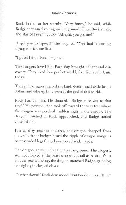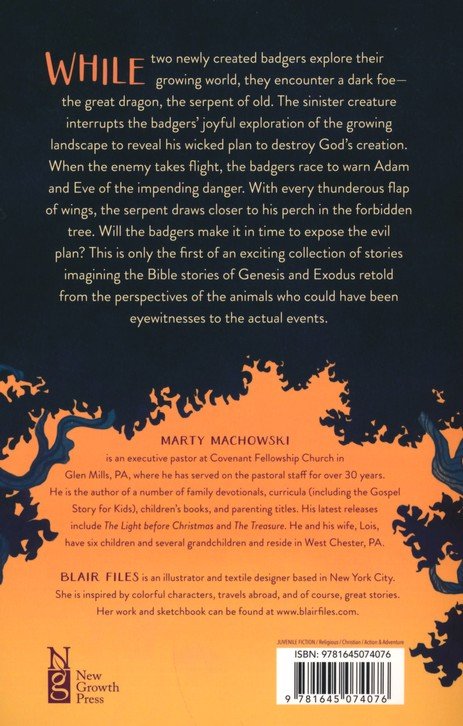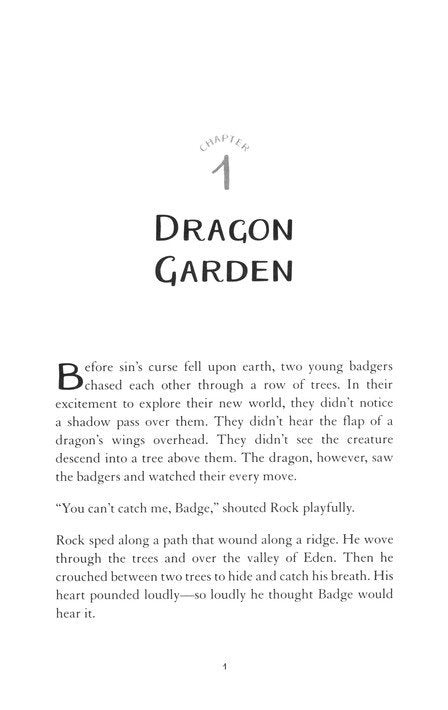 While two newly created rock badgers explore their growing world, they encounter a dark foe—the great dragon, the serpent of old. The sinister creature interrupts the badgers’ joyful exploration of the growing landscape to reveal his wicked plan to destroy God’s creation. When the enemy takes flight, the badgers race to warn Adam and Eve of the impending danger. With every thunderous flap of wings, the serpent draws closer to his perch in the forbidden tree. Will the badgers make it in time to expose the evil plan.