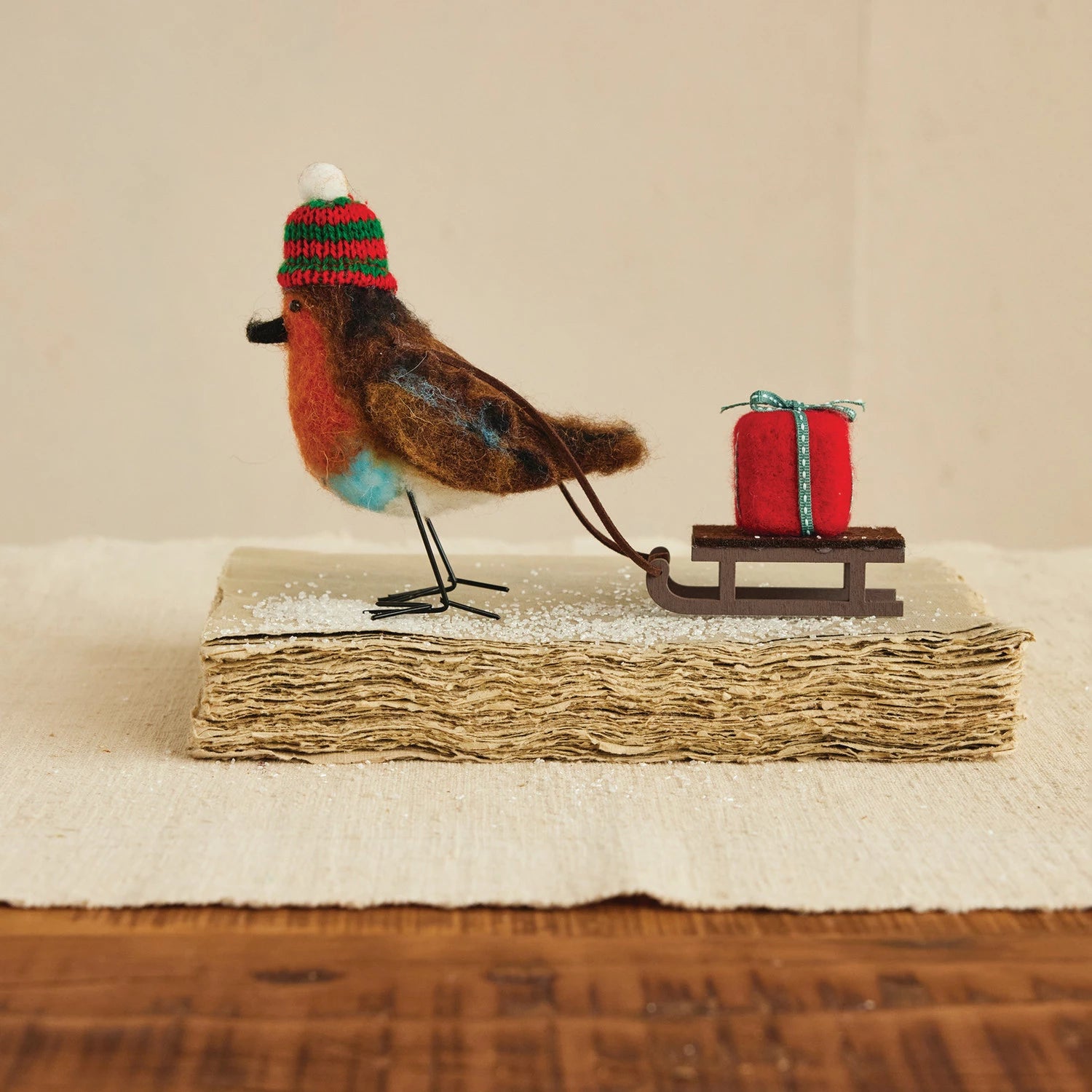 9"L x 2-1/4"W x 5"H Handmade Wool Felt Robin Pulling Sleigh w/ Gift, Multi Color